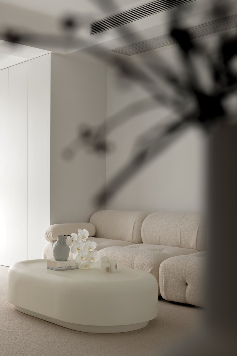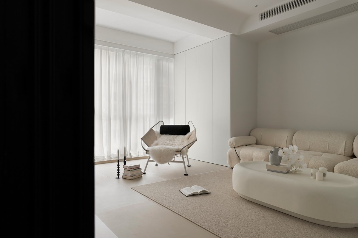 全白基底如一张干净画布,毛绒沙发的柔软弧度、异形茶几的圆润轮廓,消解了极简的冷硬感;拱形置物架隐于光影中,艺术感落地摆件似抽象雕塑,阳光透过薄纱时,整个空间都在“什么都不刻意”的松弛里轻轻呼吸。