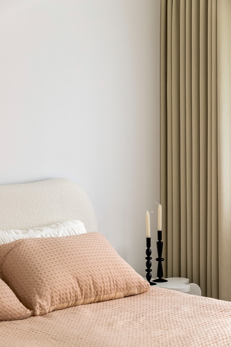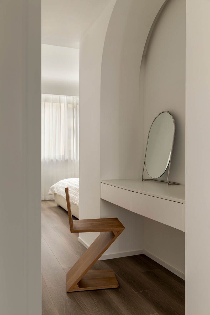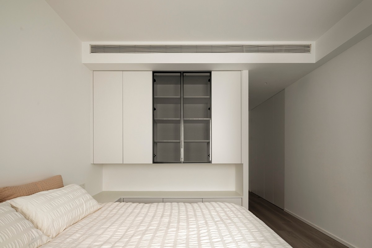 无冗余装饰的睡眠空间,以一体化柜体实现收纳与美学的统一,玻璃柜门若隐若现的层次,让极简不再单调;阳光落在肌理感床品上,整个房间都弥漫着“卸下所有纷扰,只与宁静相拥”的治愈力。