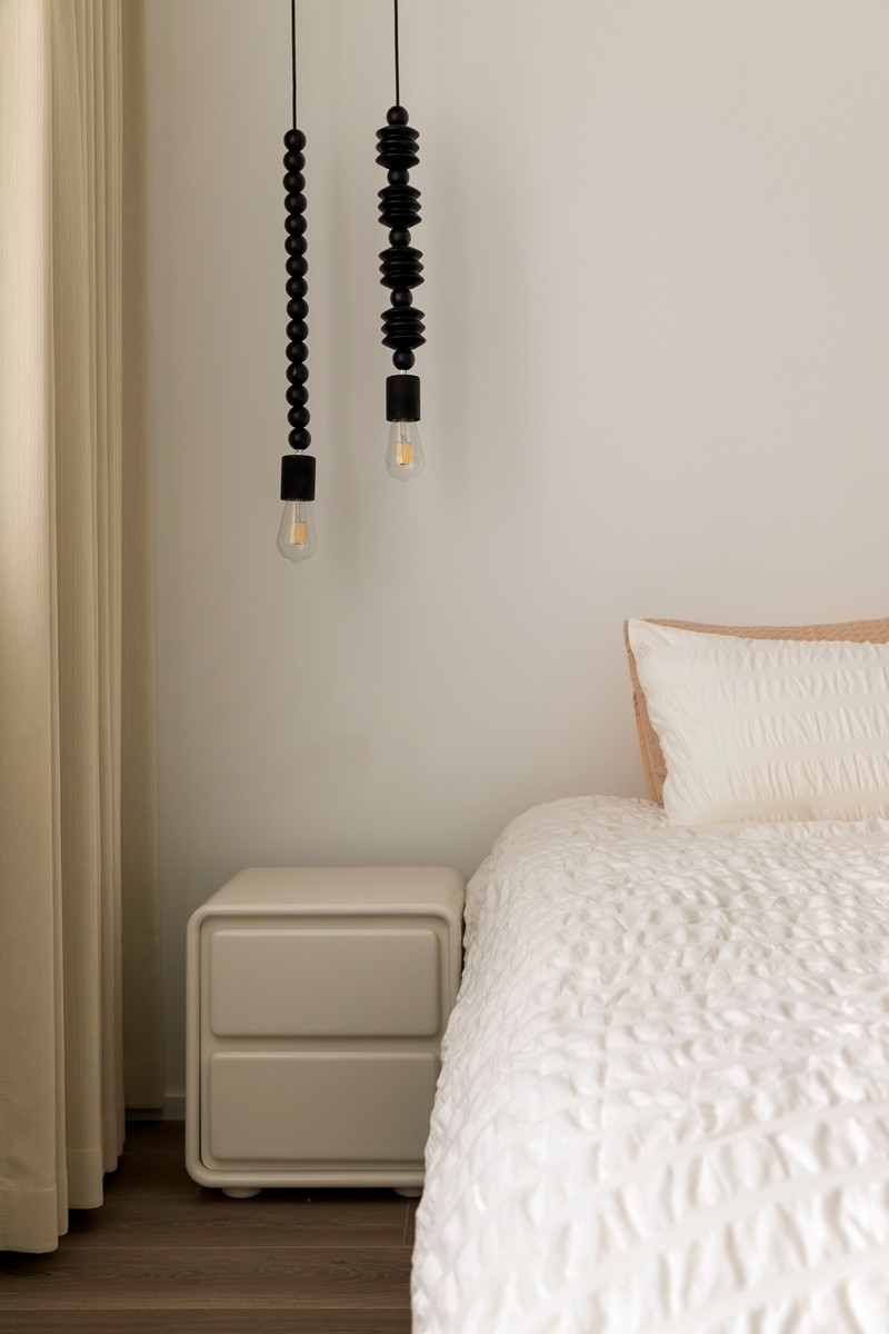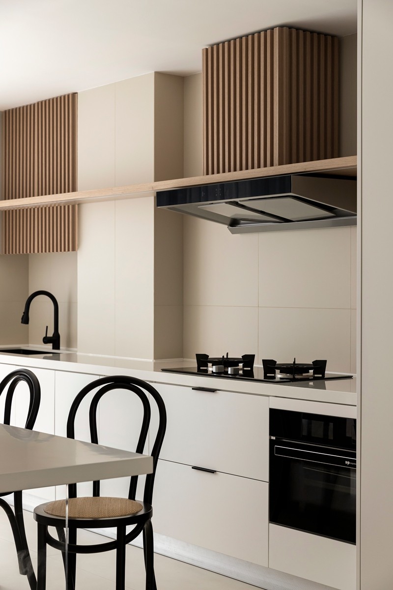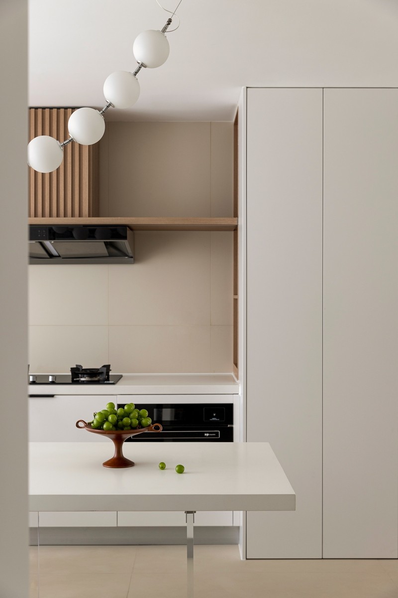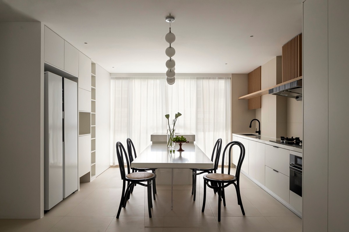 开放式餐厨以白色柜体构建秩序感,木质格栅为空间注入暖调呼吸;球形吊灯如艺术装置悬于餐桌之上,黑框餐椅的复古线条与通透台面碰撞,让下厨、用餐的每一刻,都在理性设计里生长出生活温度。