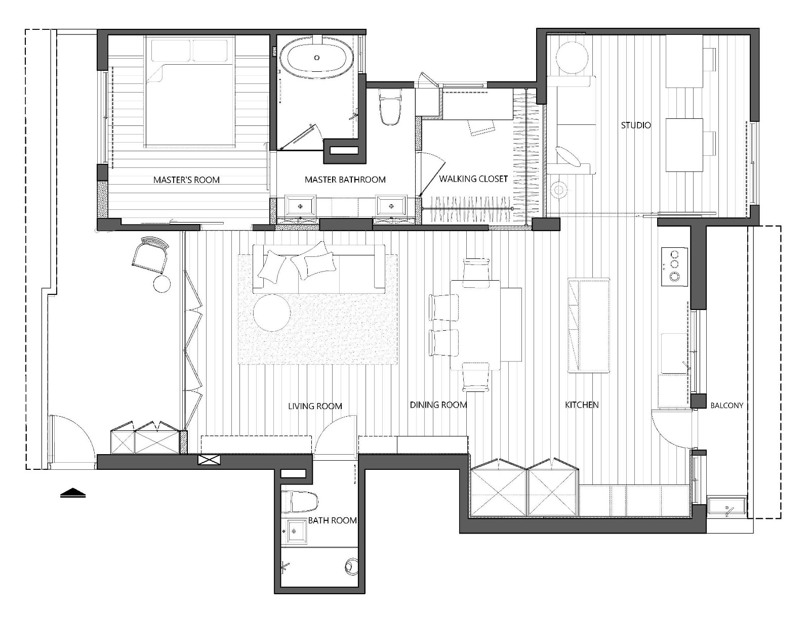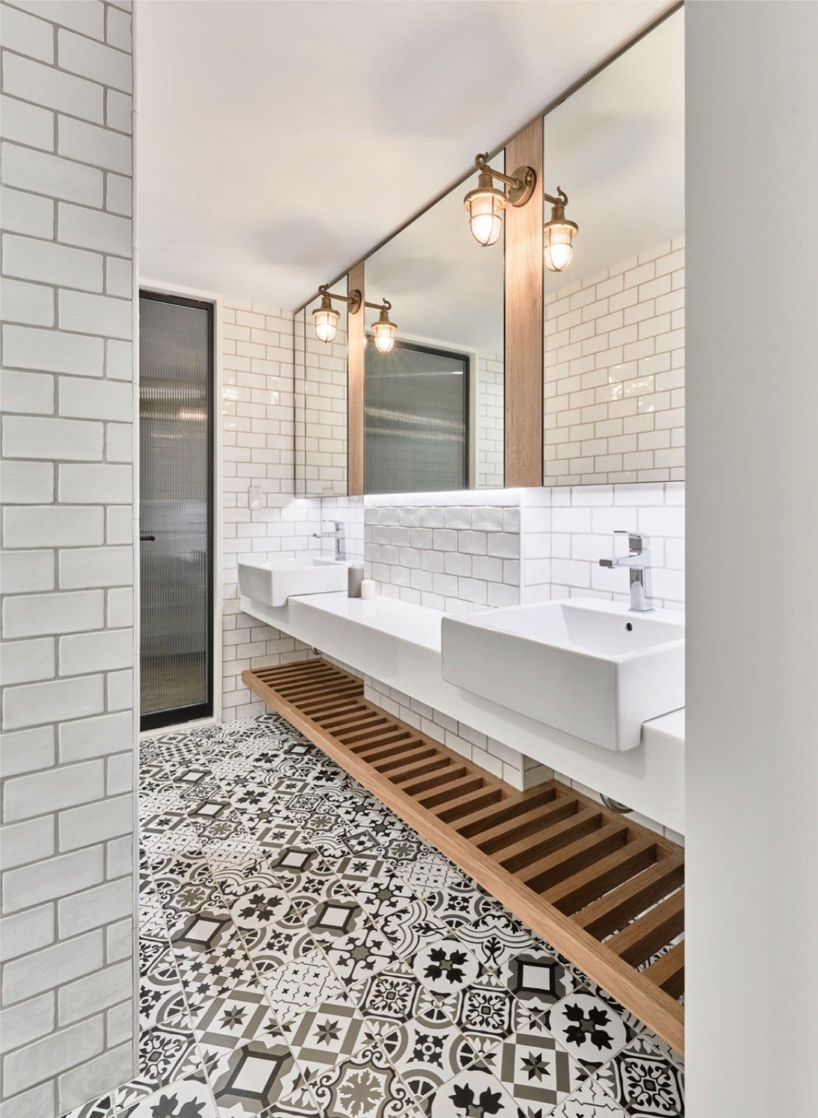 黑白花砖地面是整个空间的“复古主角”,搭配白砖墙面,热闹却不杂乱;双台盆+木质置物架,把“复古颜值”和“日常实用”绑在了一起;黄铜壁灯和厨房的吊灯呼应,连长虹玻璃门都和卧室统一,整个家的风格像“串起来的珍珠”,每一处都有呼应。