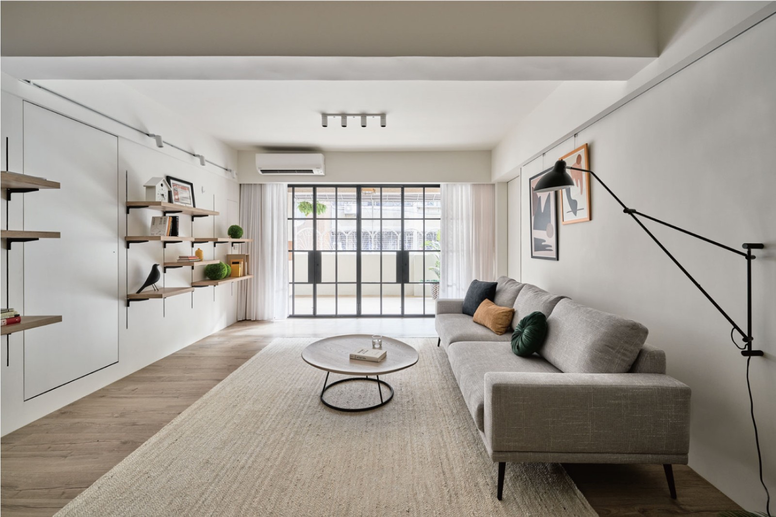 墙面是极简的大白墙,但左侧做了隐形柜门+悬浮层板,把收纳藏在“无把手”的立面里;浅灰布艺沙发搭配墨绿、焦糖色抱枕,像往白画布上点了几笔暖色调;黑色工业风落地灯+抽象装饰画,是复古感的点睛之笔;大落地窗配白纱帘,让自然光把整个空间裹得软软的,连地毯都是亚麻肌理,踩上去像踩在“松弛感”里。