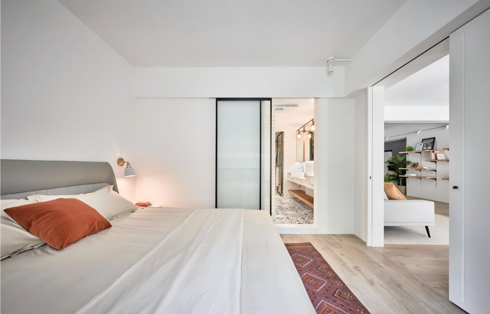 用长虹玻璃移门代替实墙,既保留了卧室的私密性,又让光线能从卫浴间透进来;床头的黄铜壁灯+焦糖色抱枕,是复古感的“轻量级选手”,不抢镜却能暖住整个空间;床尾的民族风地毯,给极简的卧室加了点“故事感”,躺在床上能隐约看到客厅的光影,松弛又不孤单。