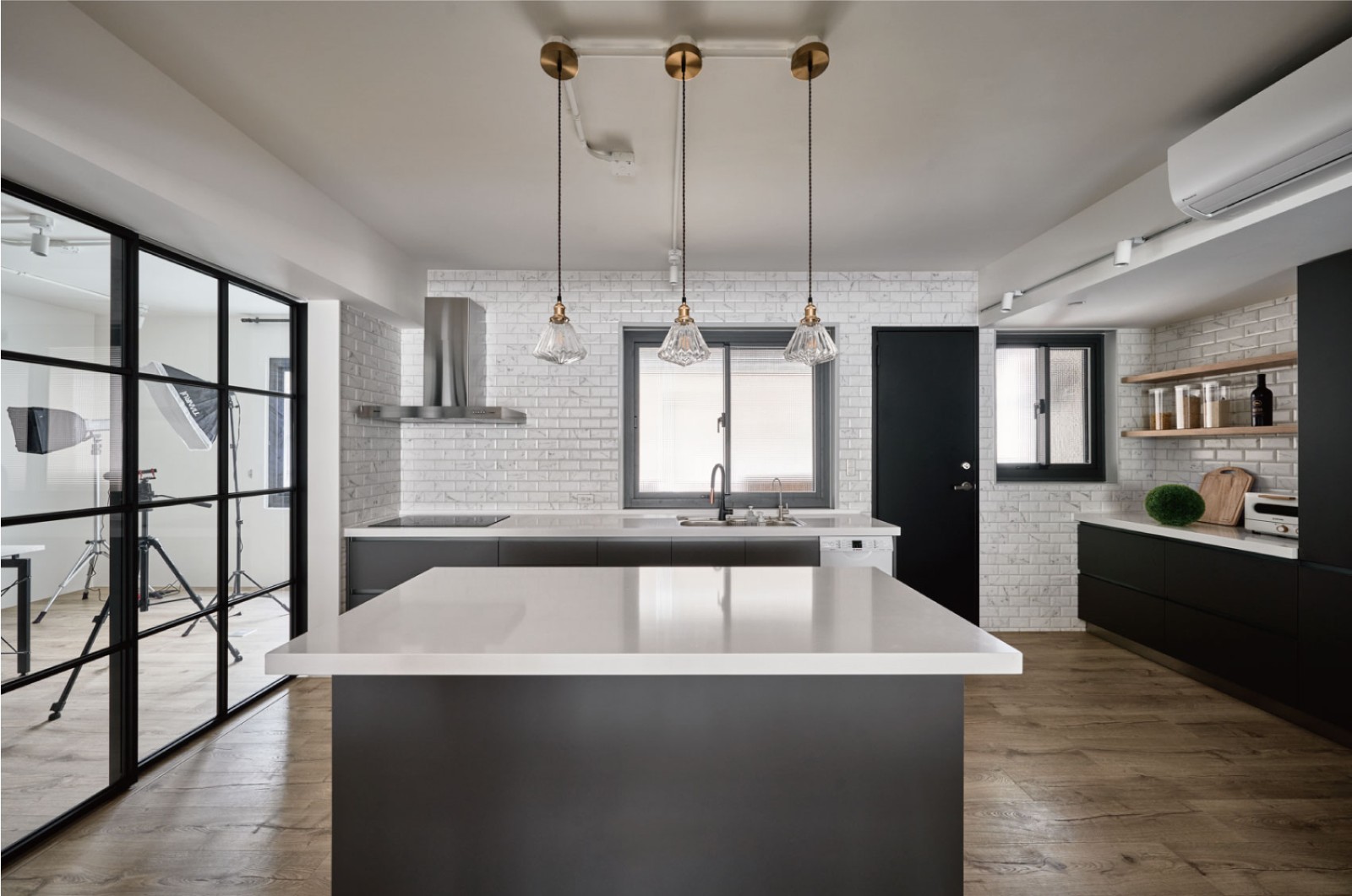白砖墙面+黑色橱柜,是经典的“复古撞色”;裸露的水管吊灯+黄铜灯座,把工业风的粗粝和复古的精致揉在了一起;玻璃移门既不挡光,又给厨房做了“软隔断”,连置物架都选了原木色,中和了黑白的冷硬,做饭时像在“复古咖啡馆的后厨”。