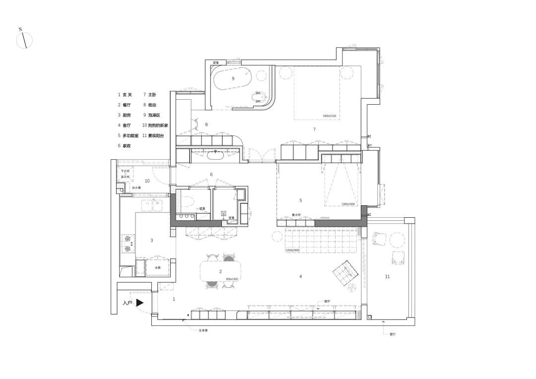 1,核心调整从厨房开始,原先的L型厨房操作空间不足,改造后调整了厨房到生活阳台的动线,将工作阳台的开门方向移到原本卫生间的位置,让厨房成为一个相对完整的U型空间,利用率更高。2,基于以上动线做出一个三分离的洗漱间、马桶间、淋浴间,扩大了原本小小的洗漱台,并且增加了更多的收纳功能。 3,把原先西北面的小卧室纳入到主卧,成为主卧的衣帽间和化妆间。原有主卫改为泡澡区+备用的入厕区,以形成一个套房的设计