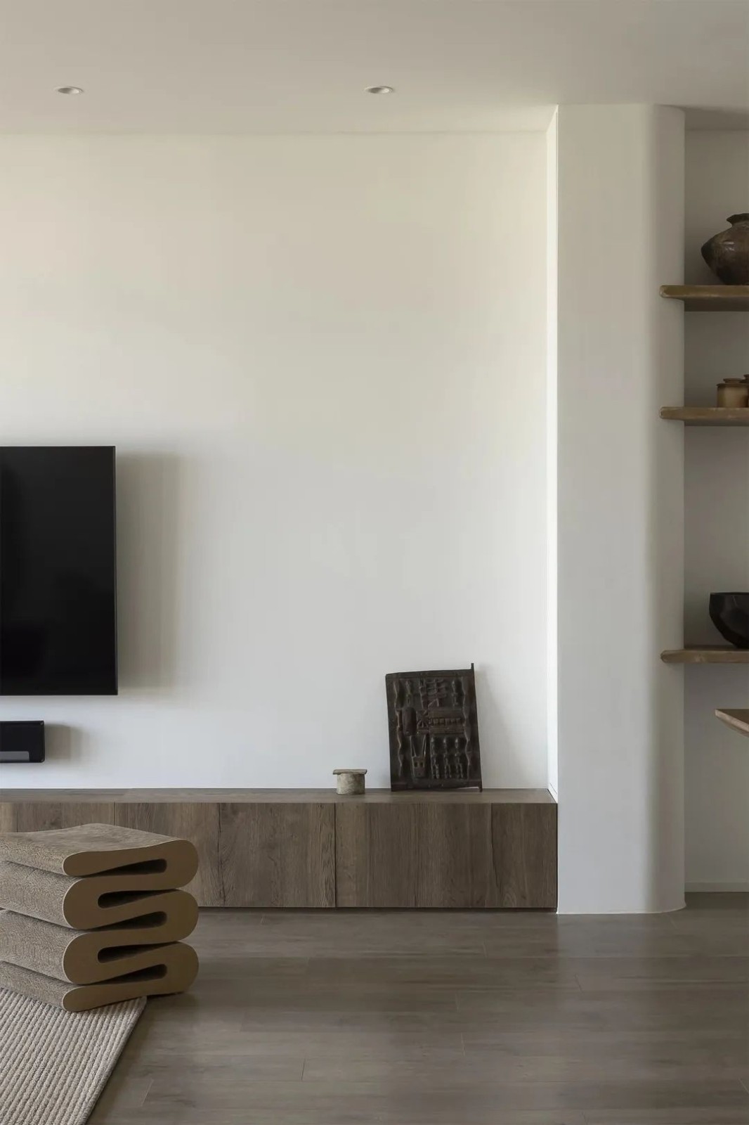 干净的空间配合不规则的手作感矮凳 矛盾亦和谐
