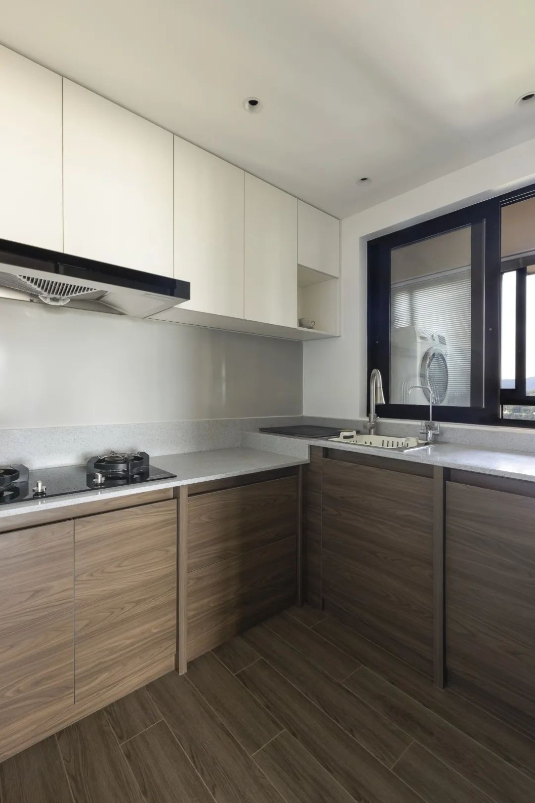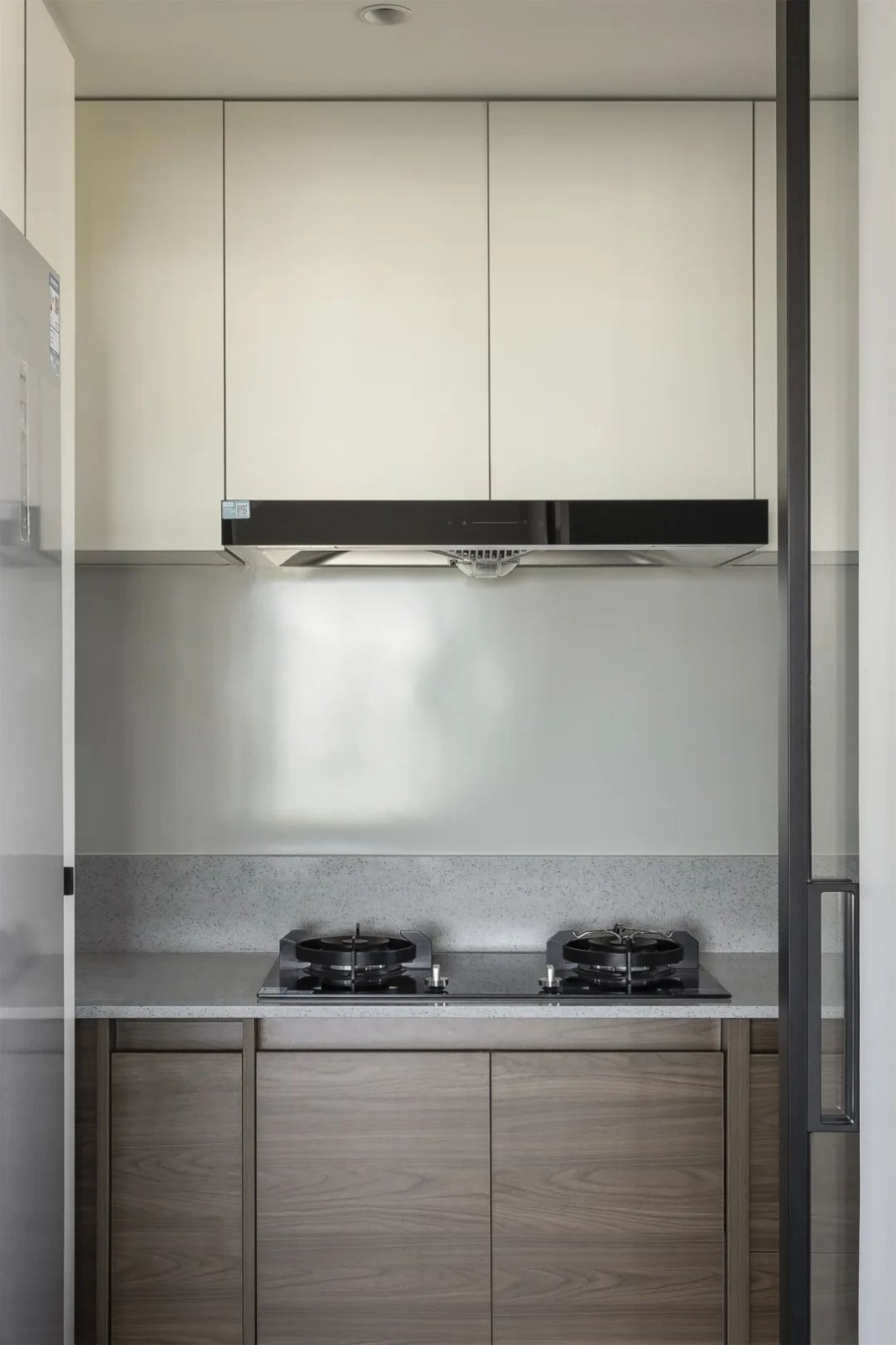 地柜和吊柜用了两种不同的配色 上浅下深 中间露出来的部分是珐琅板 完整一片没有任何缝隙 看起来比较清爽