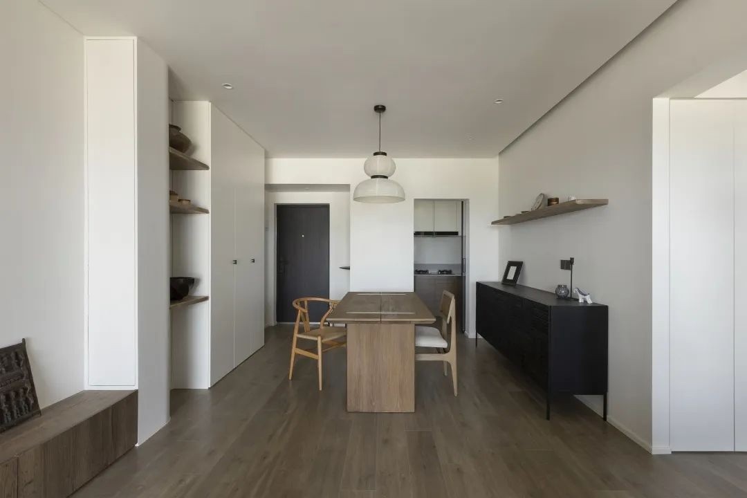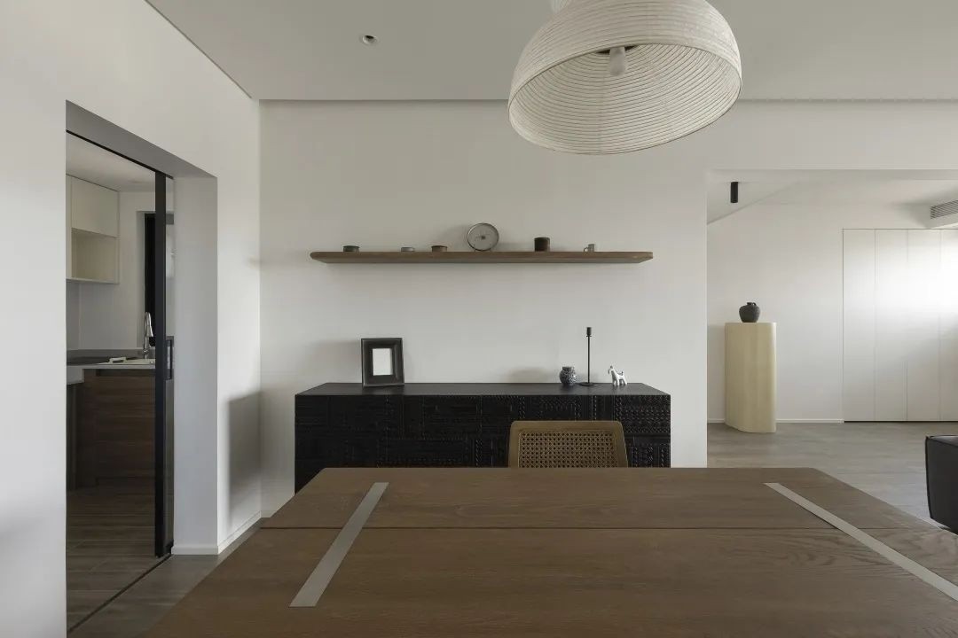 胡桃木餐桌搭配CarlHansen&Son的CH24餐椅 实木温润的质感在白墙映衬下显得质朴而沉静 餐桌上方&Tradition吊灯圆润柔和 点缀得恰到好处 非洲雕花餐边柜上的墙面 添置了一列表面肌理不规则的原木层板 可以用来展示一些屋主的藏品
