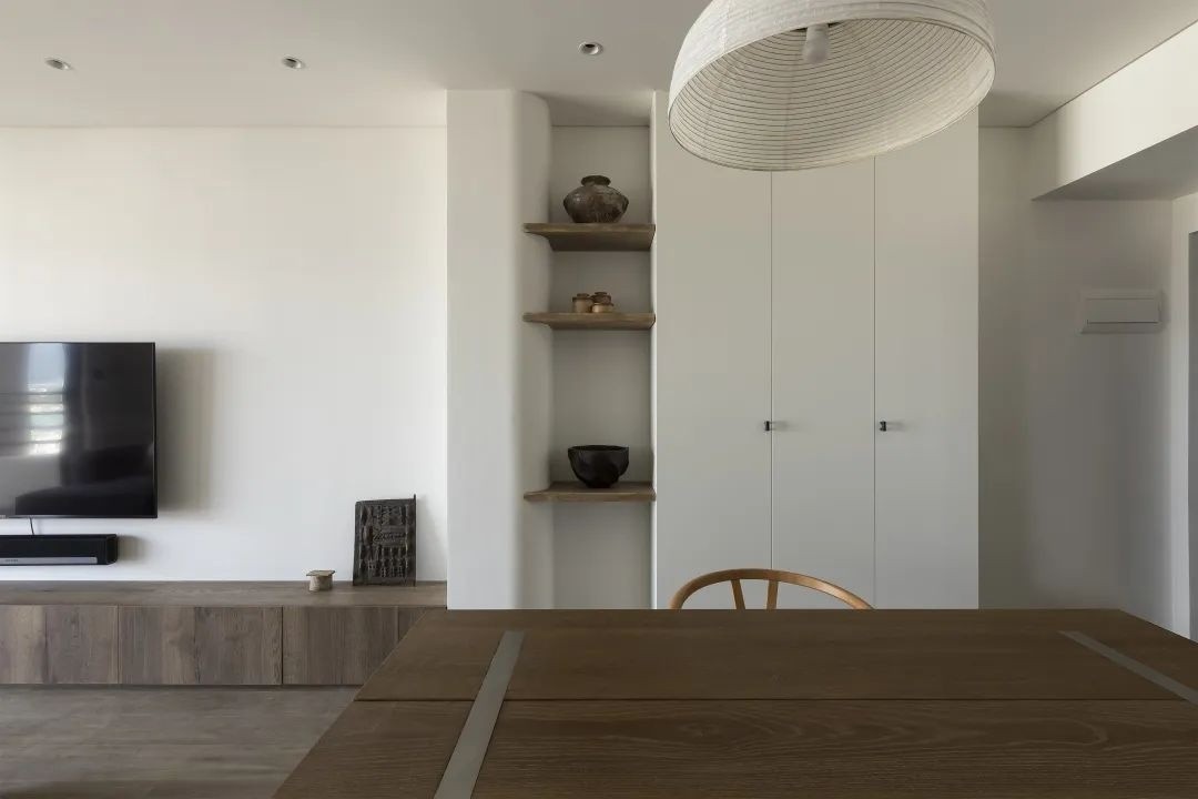 客厅与餐厅连接处做了一列350深带弧度的柜体 手作感的层板中和一旁工厂定制板的机械感