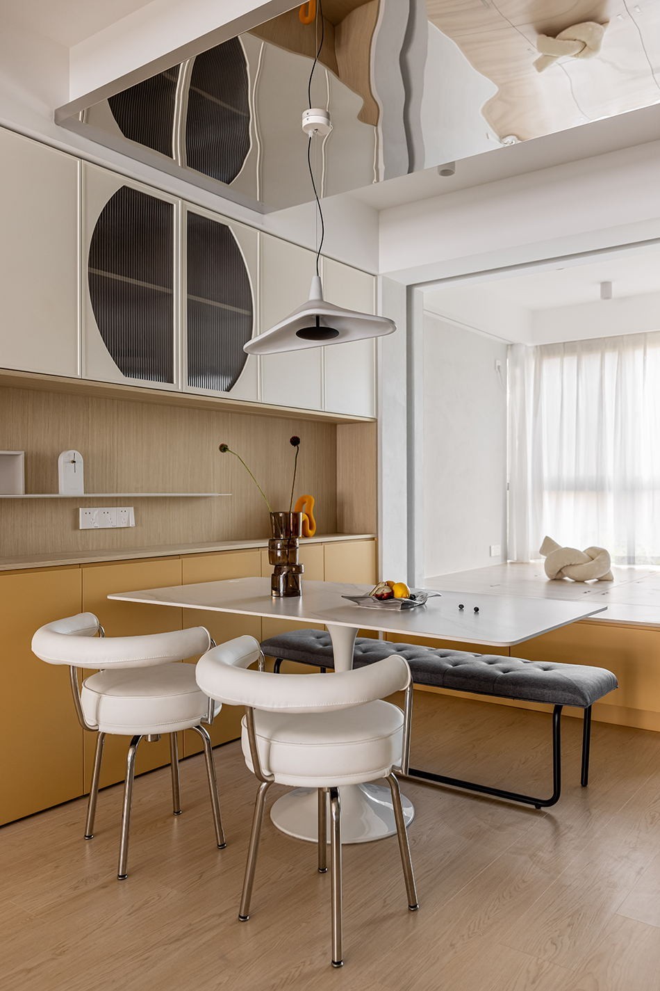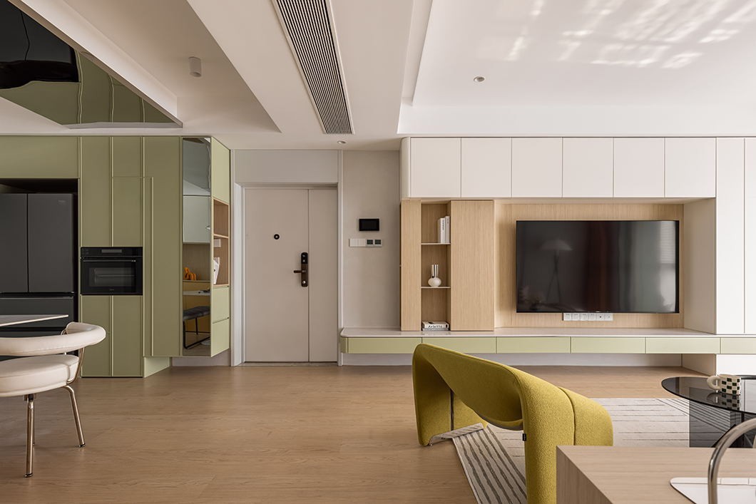 现代空间中大面积运用暖白与原木,搭配浅草绿,趣味黄色系,达到温馨且有格调的居家氛围。