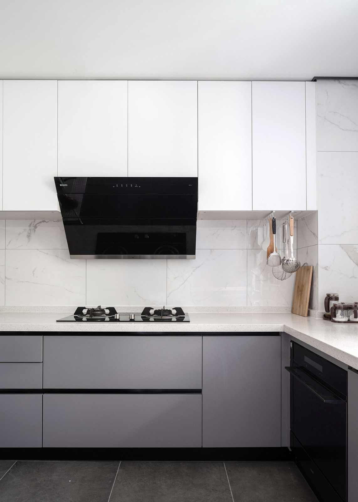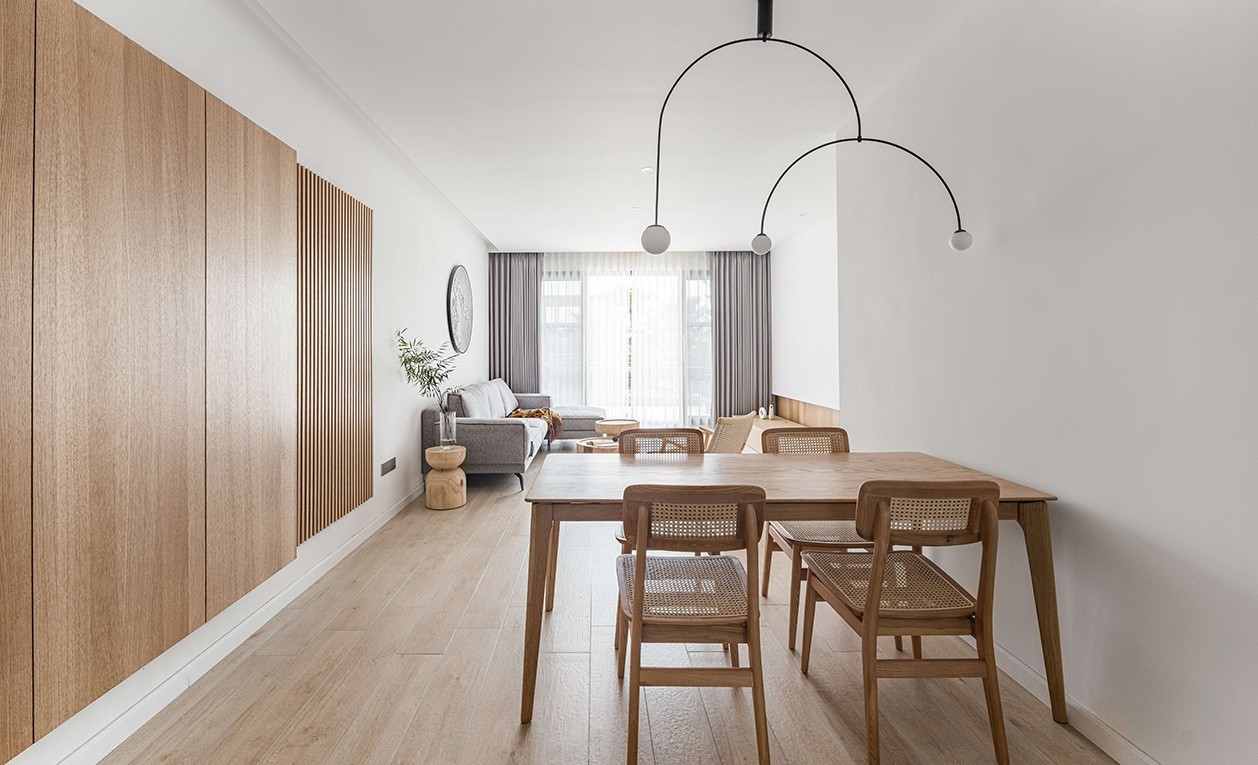 温润质朴的天然橡木饰面,与自带清冷气息的哑光漆相得益彰,辅以隐形灯带烘托氛围,勾勒轮廓,瞬间提升了空间的层次性。