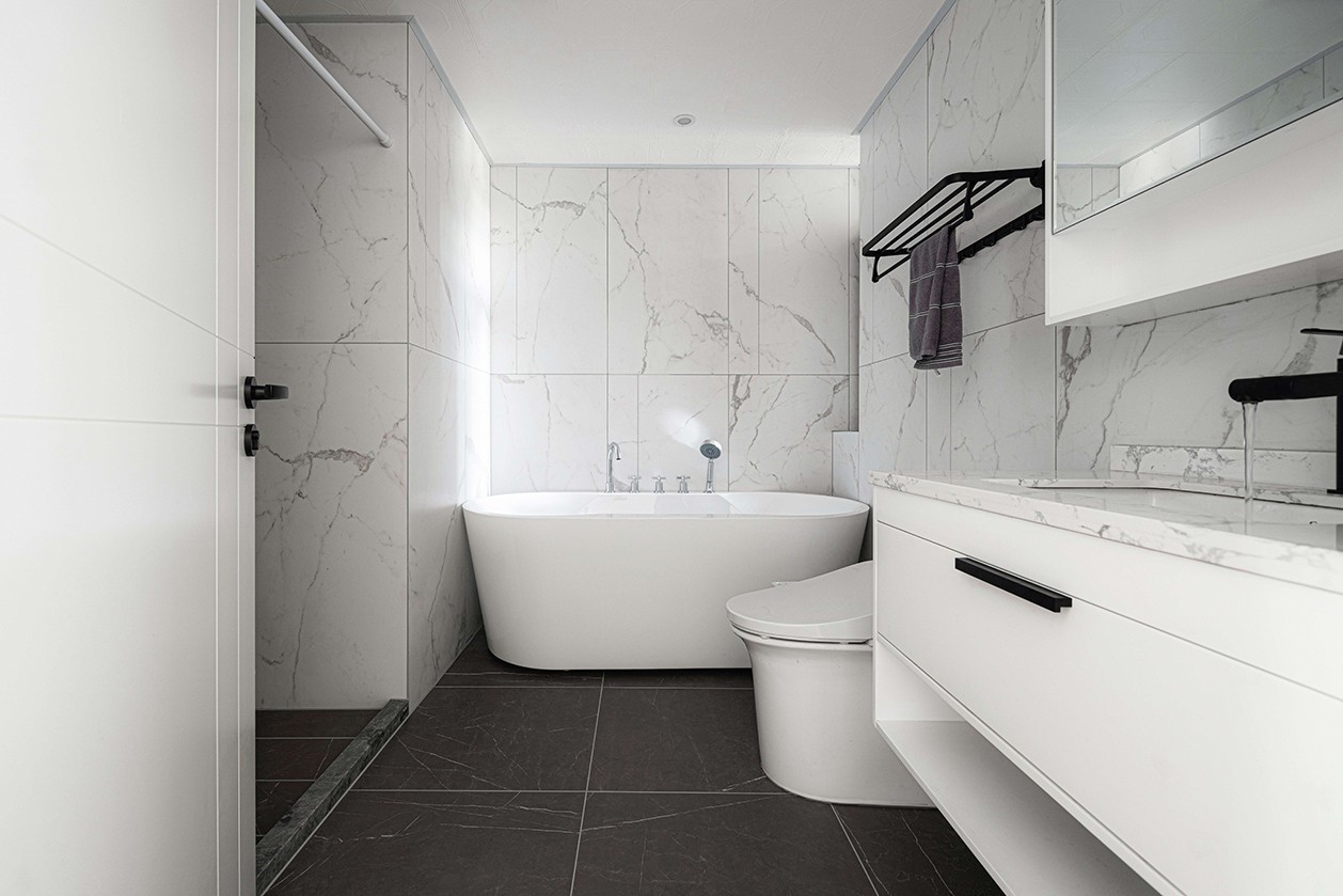 镜柜、隐藏式灯带墙砖的细纹理,混合在一起营造出了水墨画韵味。
