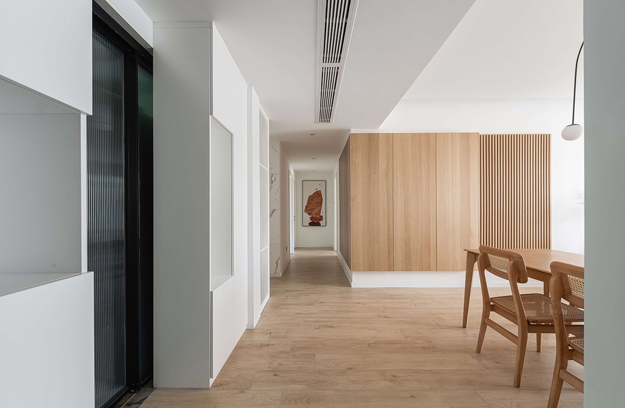 入户左手为玄关换鞋区,一镜到底的空间通透感,让空间倍感舒爽与透亮。