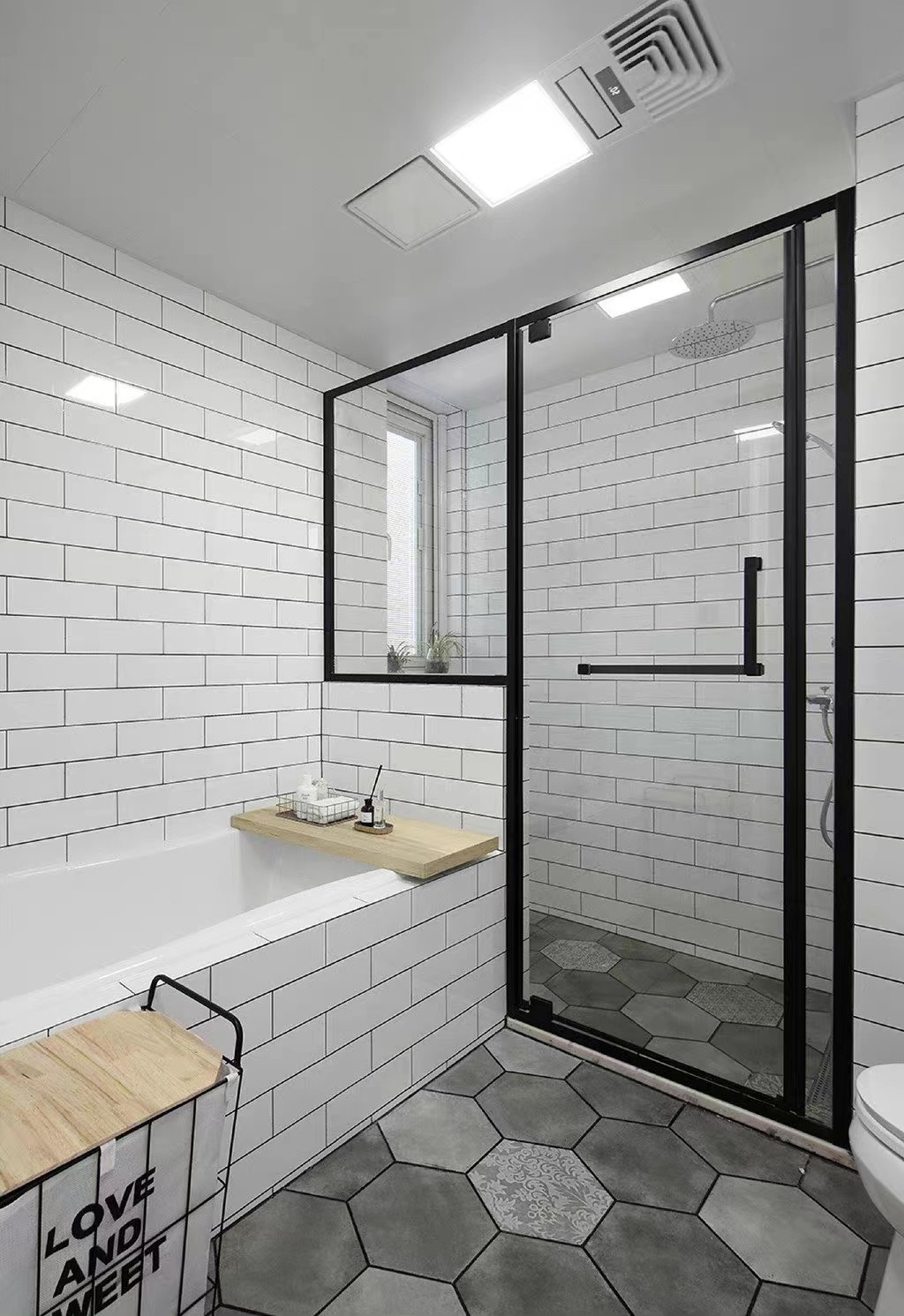 卫生间黑白对比鲜明,地面用菱形砖