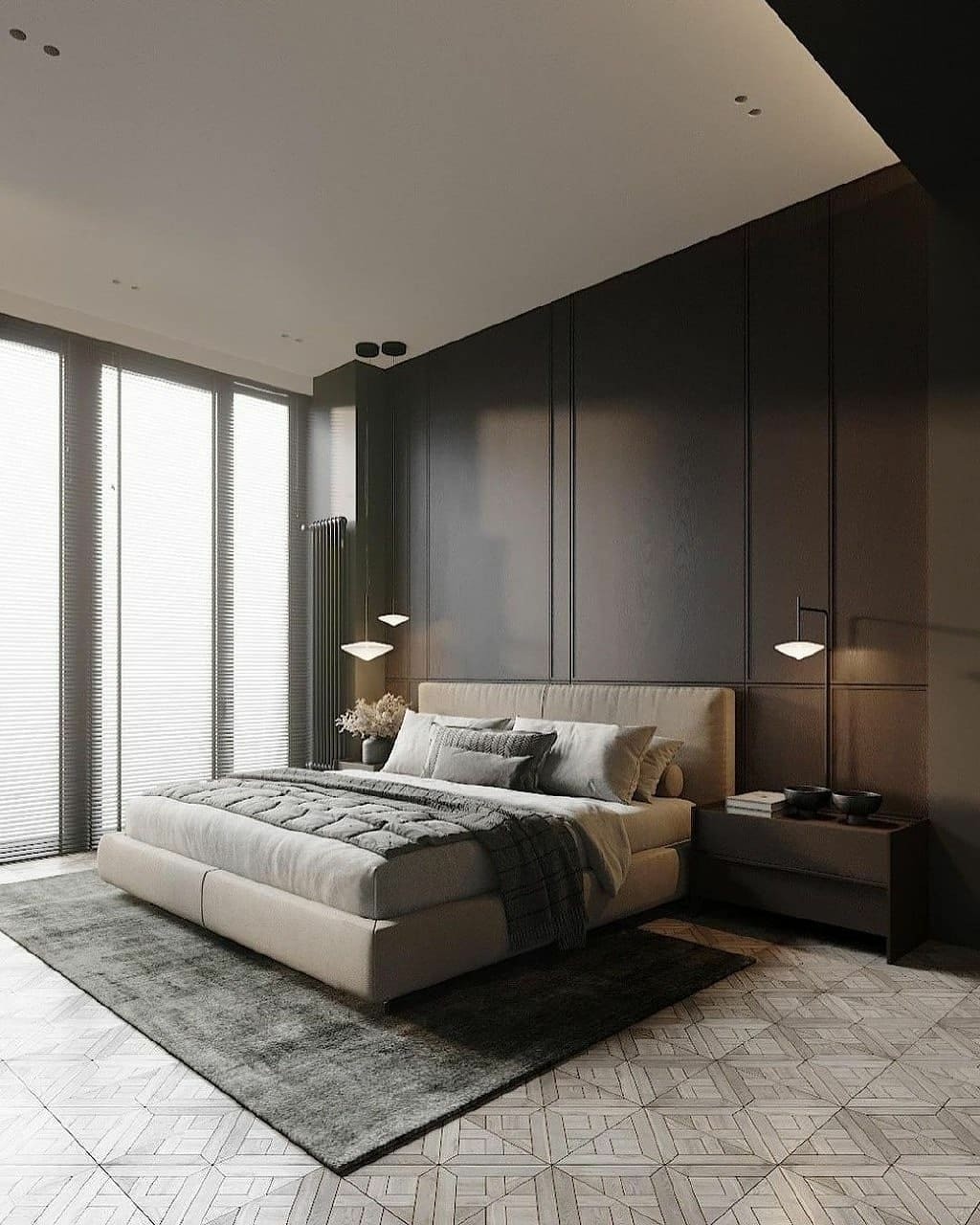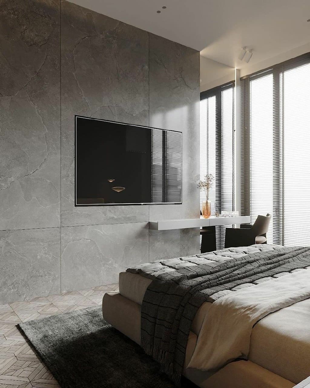 卧室也安装了落地窗,节约空间的百叶窗帘看上去干净利落。