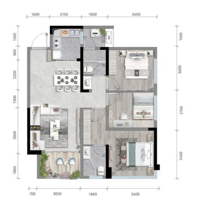 户型方正,动静分区;LDK双厅设计(客餐厅+景观阳台连通),增加互动与采光;