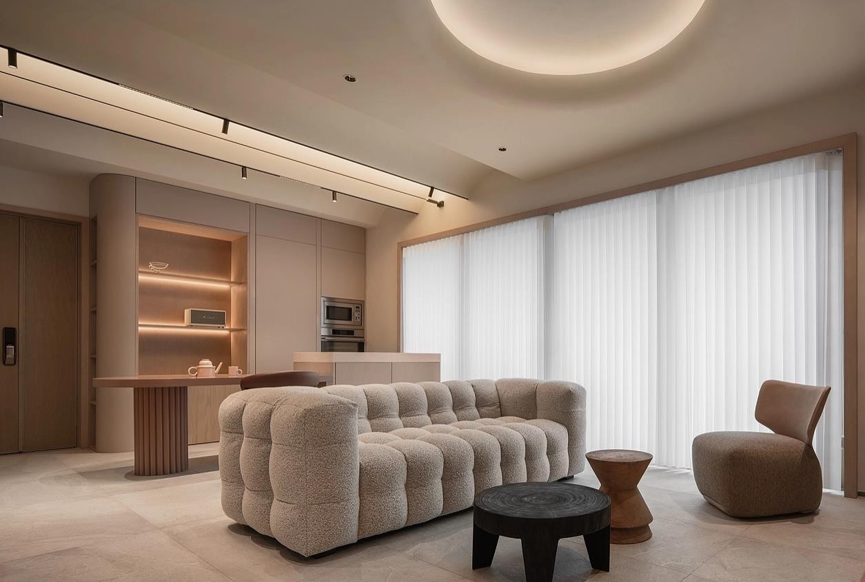 灵活,多样性的空间,都在一一展示幻化出简练而深邃的空间语言。设计师在做客厅空间规划时,“理性”的做了一些“减法”,弱化了具有明确功能的空间单元划分,而这些多元空间又被构建出的体块巧妙地连结穿插在一起,层次与进退,前后空间的联动,在展示功能材质的同时,也相互协调着周边的环境。