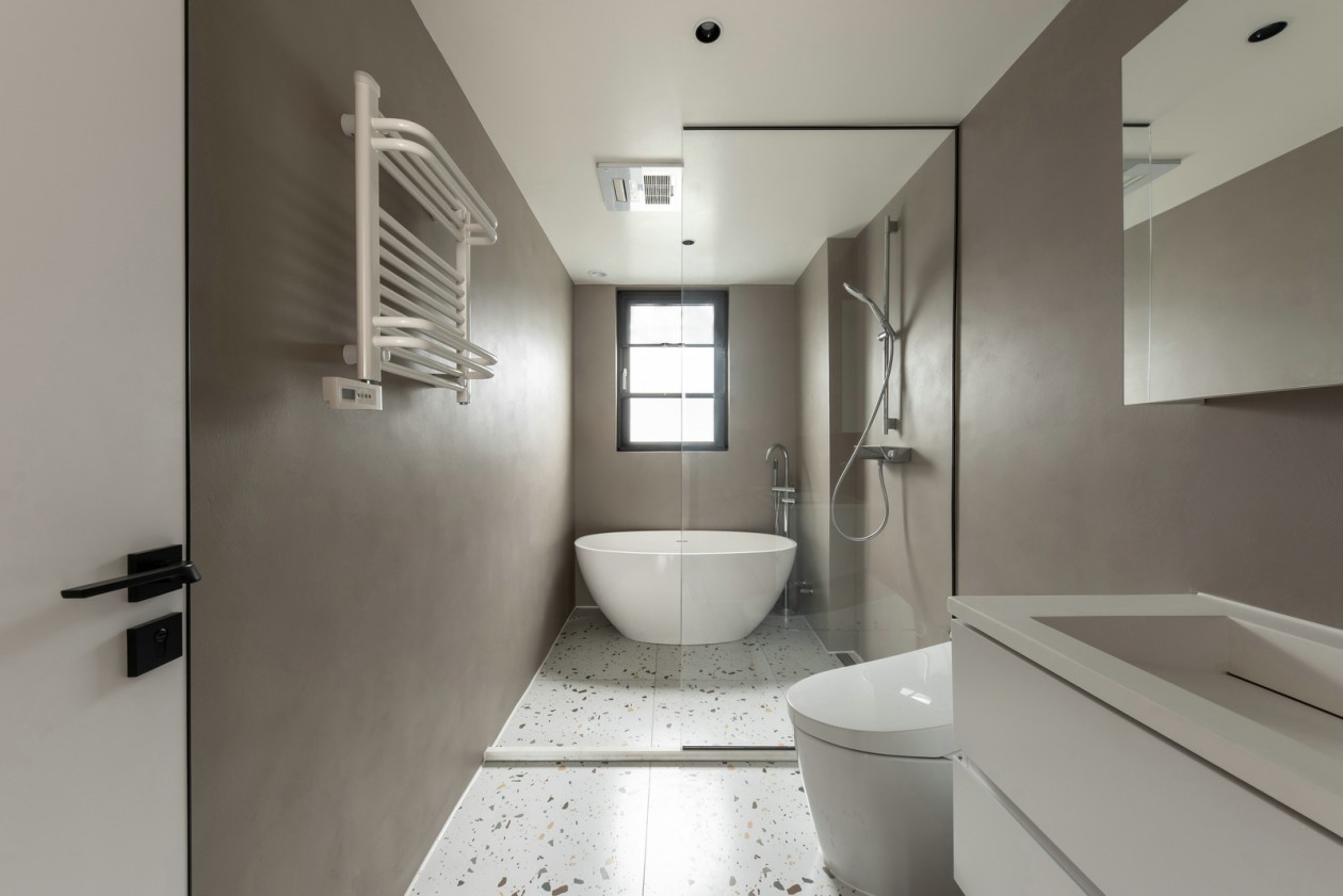 微水泥上墙,地面铺水磨石地砖,玻璃作为干湿分离的隔断