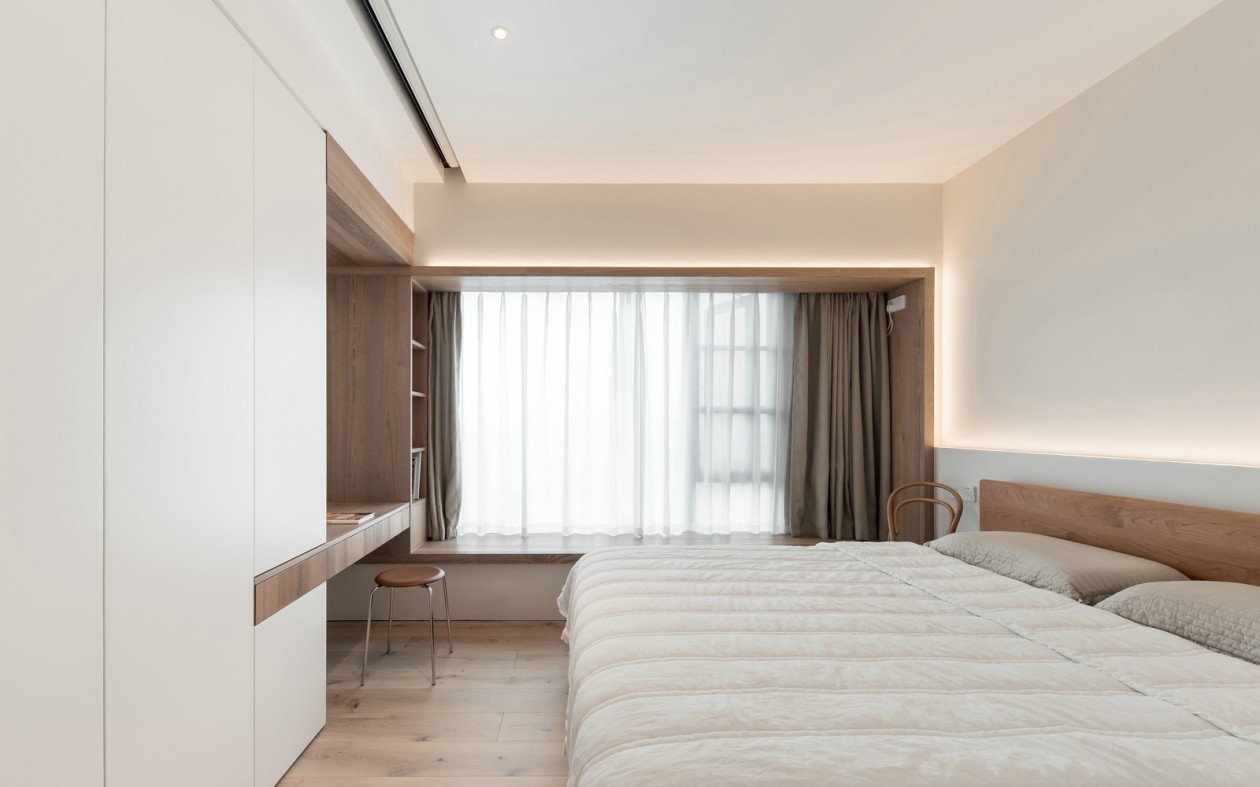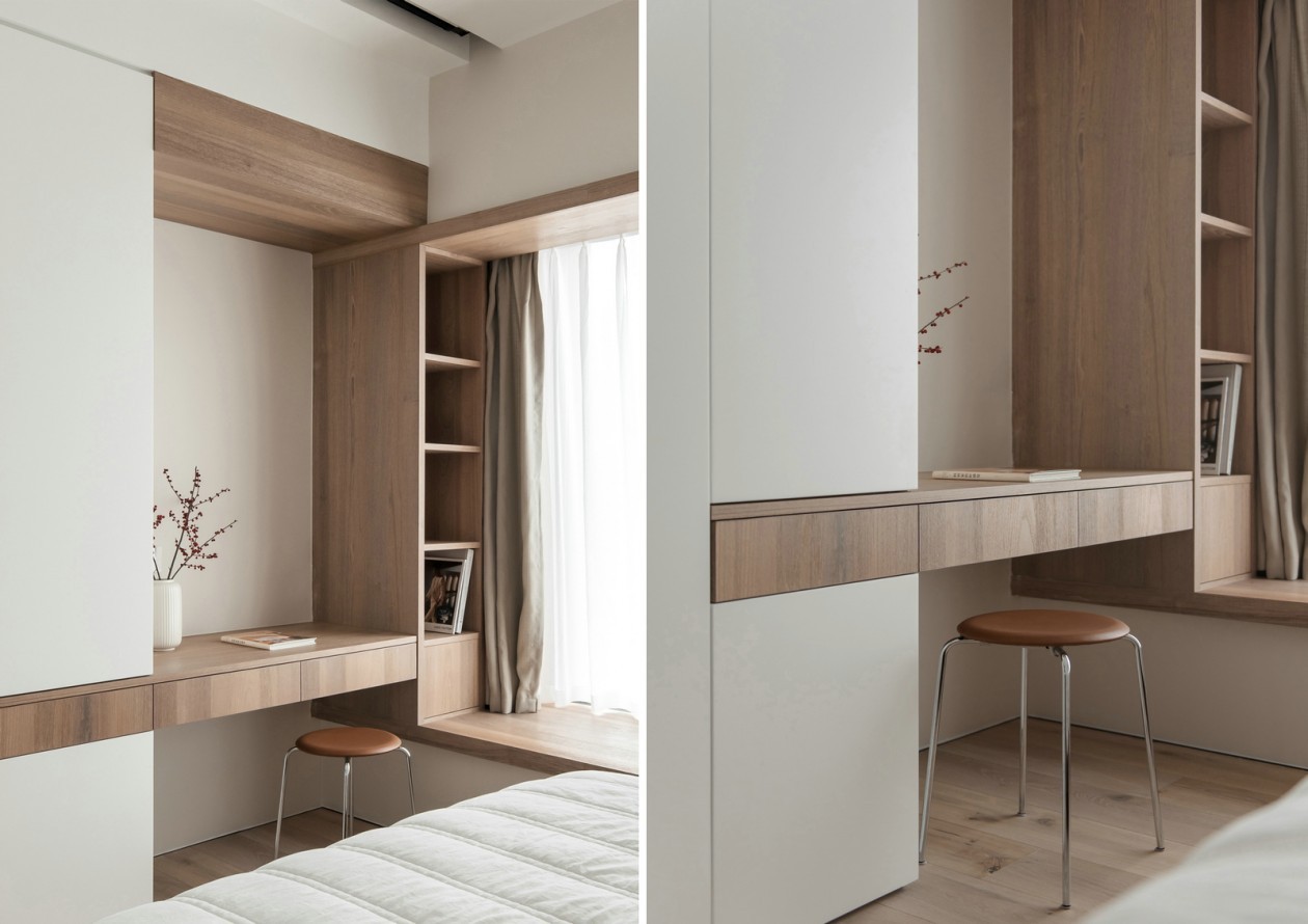 用木饰面包裹的梳妆台与飘窗台