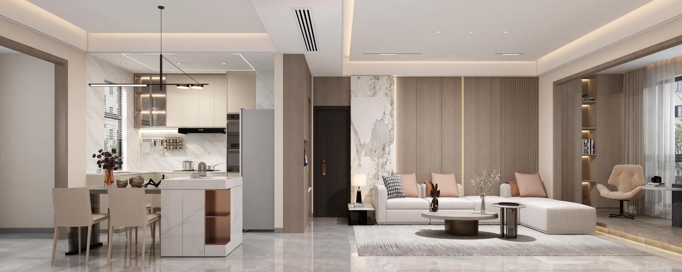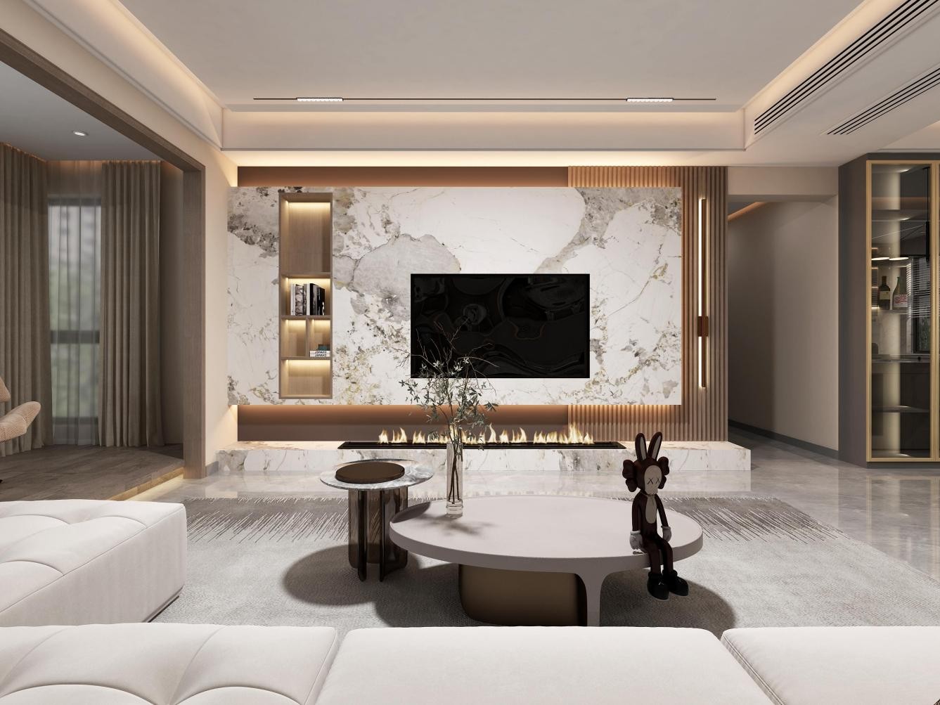 大理石纹理配深色木格栅 用灯光烘托电视背景墙的氛围。