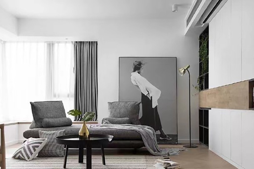 客厅的颜色上使用黑白灰搭配原木色,搭配大幅落地画增加艺术感