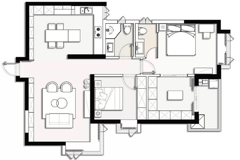 此户型为原始三居室,应业主需求改为两居室,主卧带独立衣帽间,客厅采用对坐形式,厨房使用餐厨一体设计