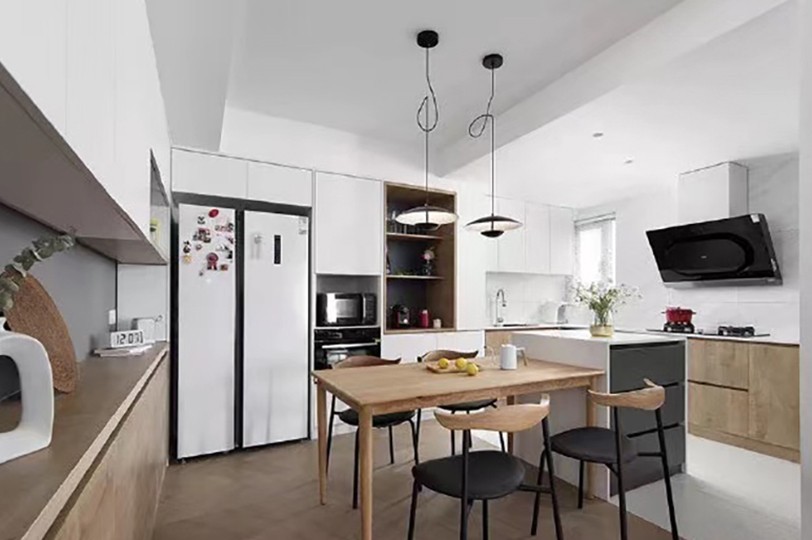 厨房空间采用餐厨一体形式,利用岛台来增加储量的同时拉进用餐距离