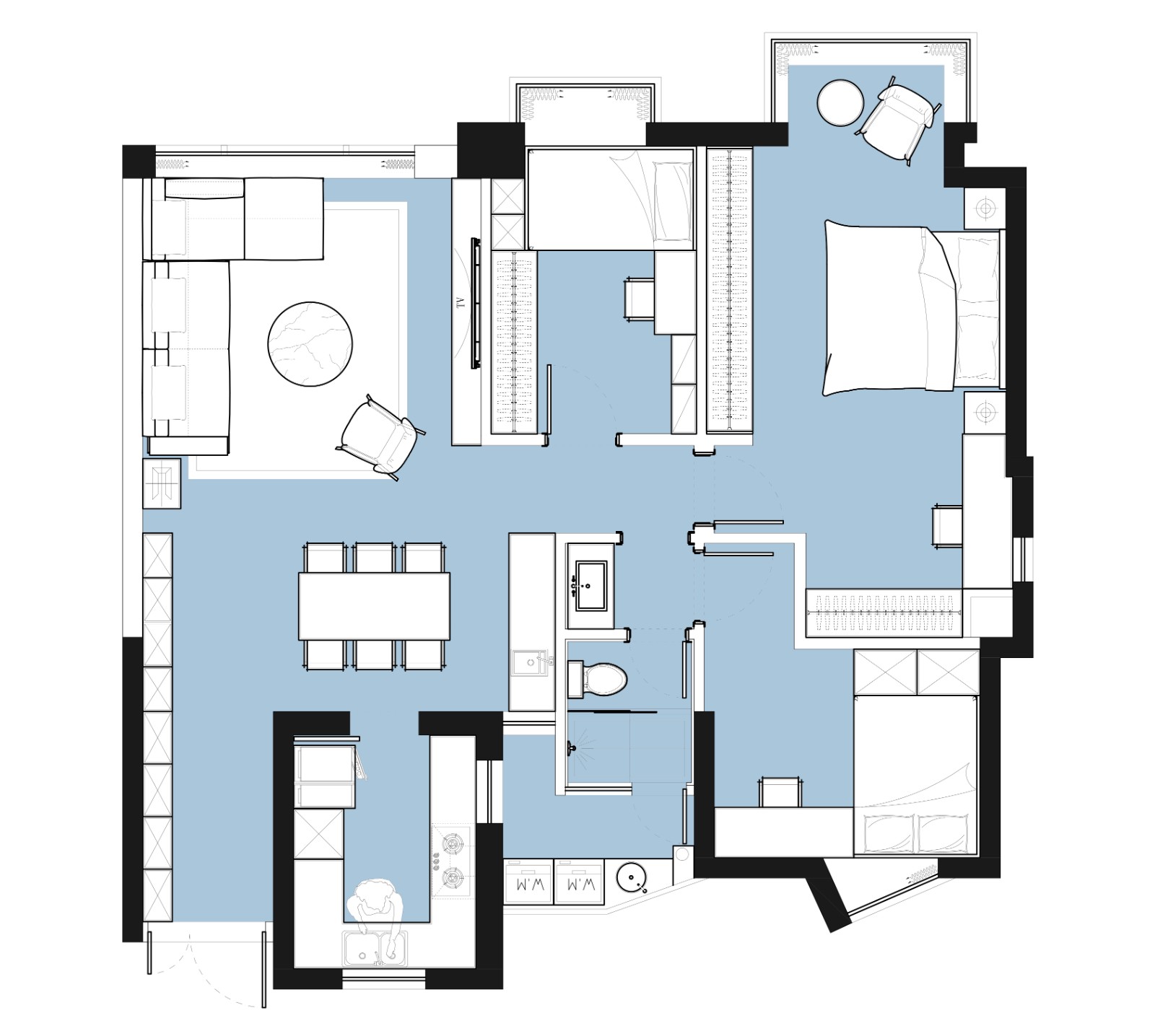 业主家的常住人口是夫妻二人+一个2岁的男宝宝,对于房子的诉求是: 1. 尽量宽敞明亮,收纳功能要强 2. 男业主平时工作较忙,回家后偶尔需要加班,所以需要给男业主一个简单的办公位 3. 希望主卧空间大而通透,可以取消主卧的卫生间 4. 希望厨房空间可以大一点 5. 保留一个次卧,作为临时客房使用