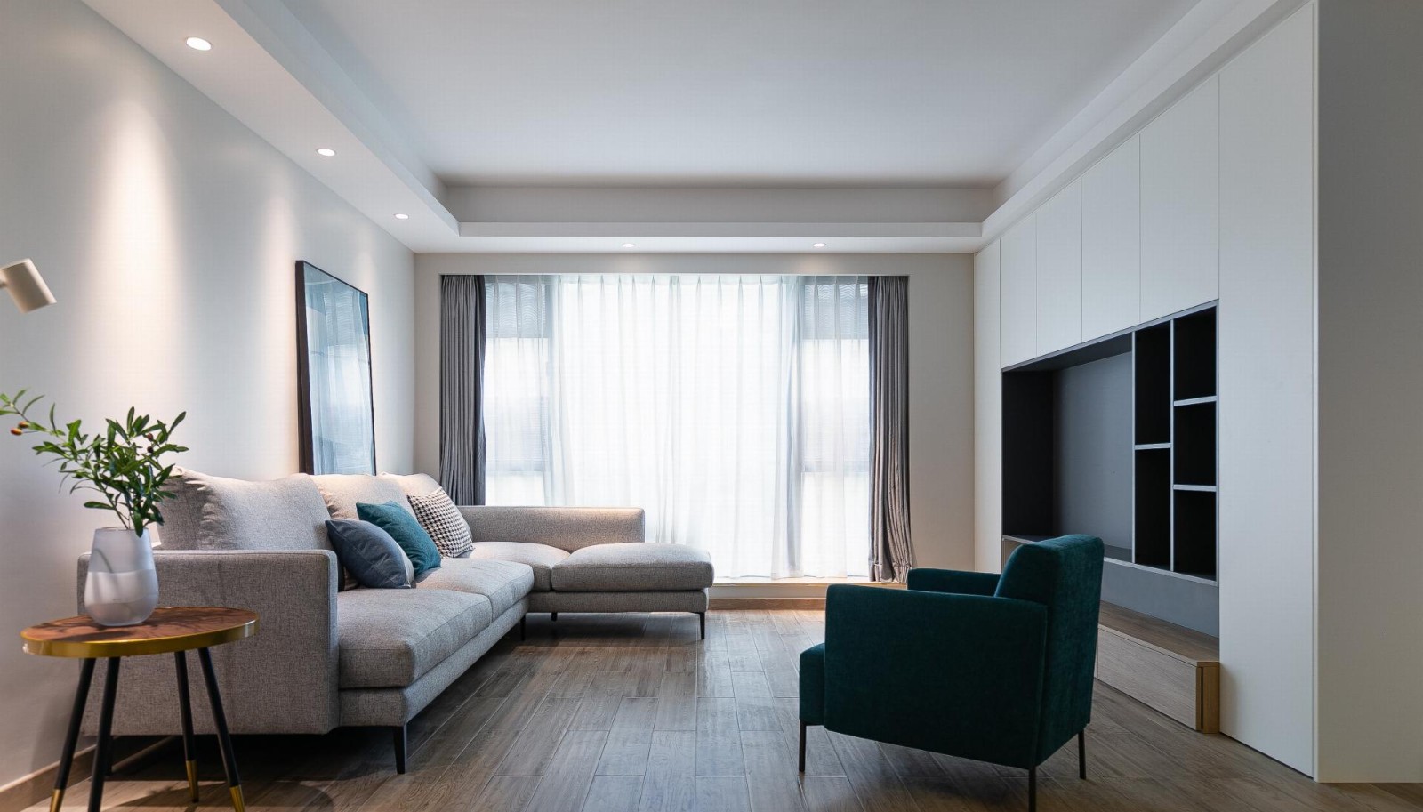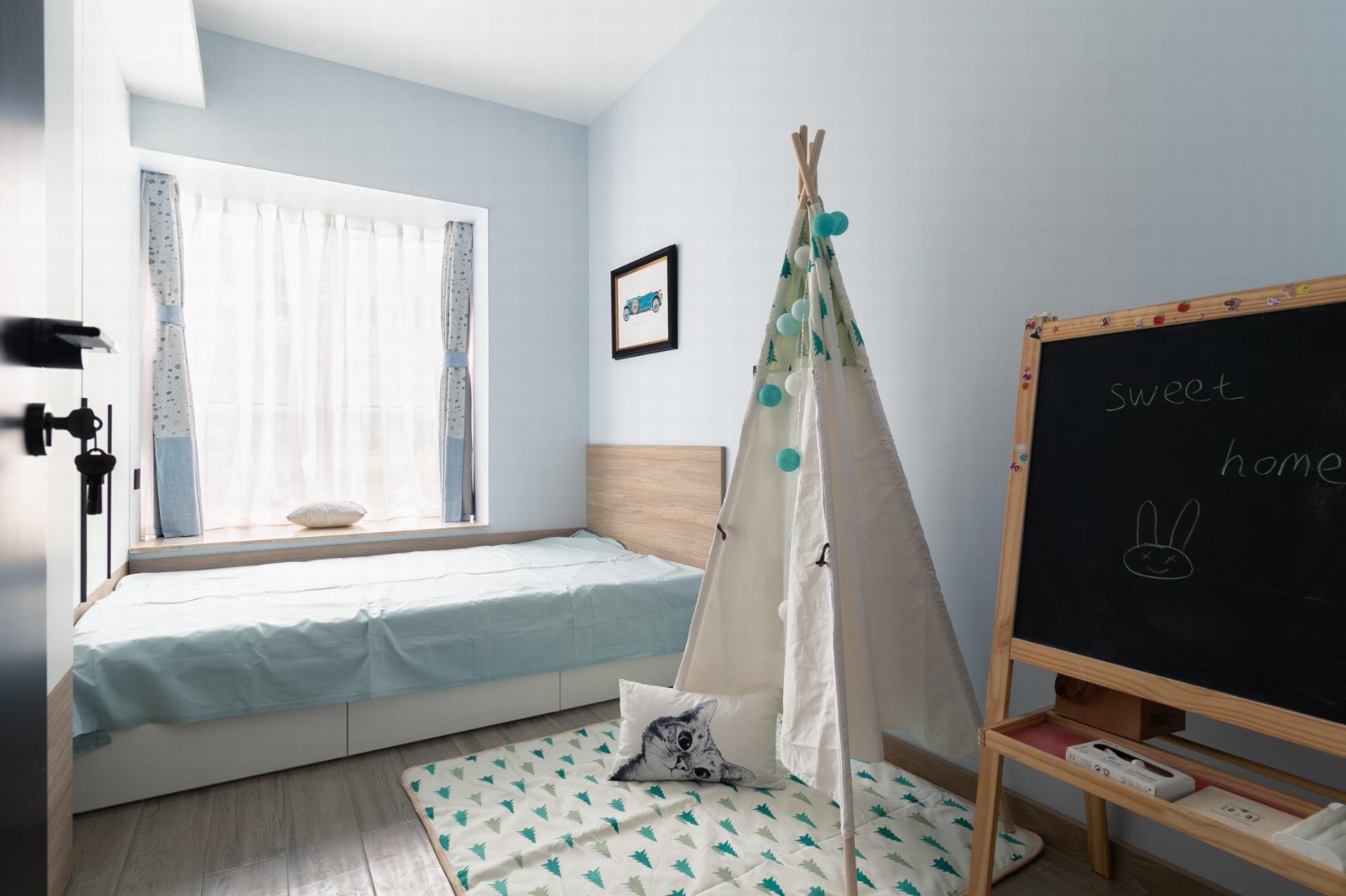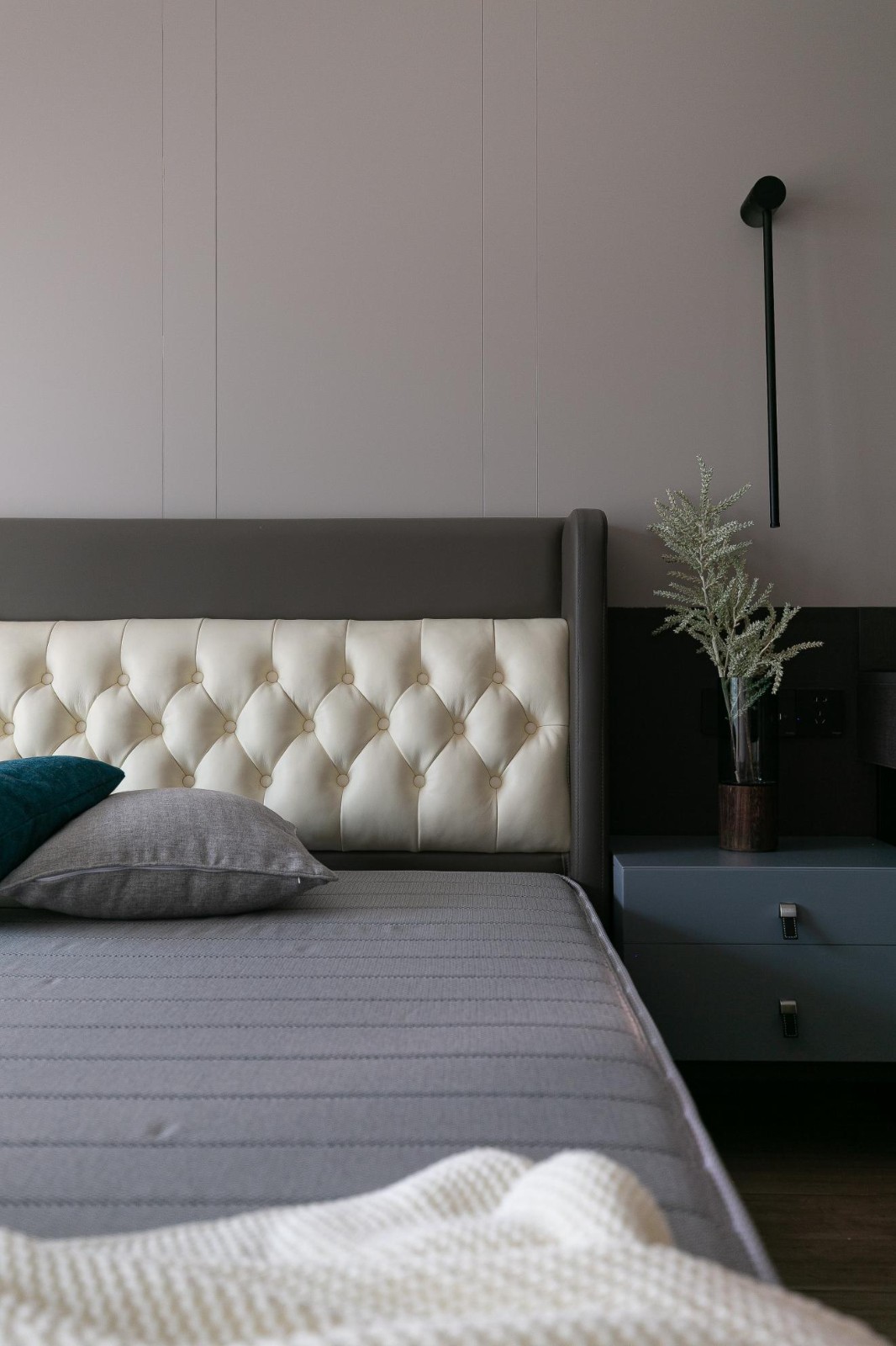 浅灰蓝色的床头柜,颜色柔和不跳跃,同时充当着空间色彩的缓慢过渡作用,统一协调,又不尴尬。浅蓝色的纱帘柔和了直射的阳光,也给整个主卧营造了一个自然而宁静的睡眠空间。