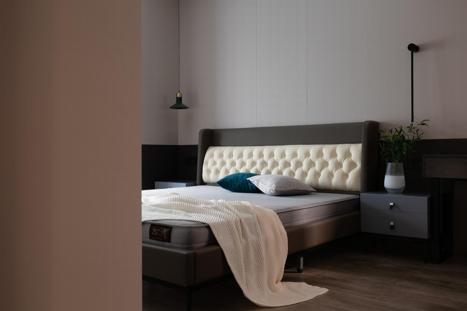 看!远处那缓缓飘来的朵朵白色软包,就像忽而从海面深处飘来的棉花云朵,简单干净又让人忍不住想去掐掐,搭配深棕色原木柜体及书桌,深浅色调互补,典雅又和谐。