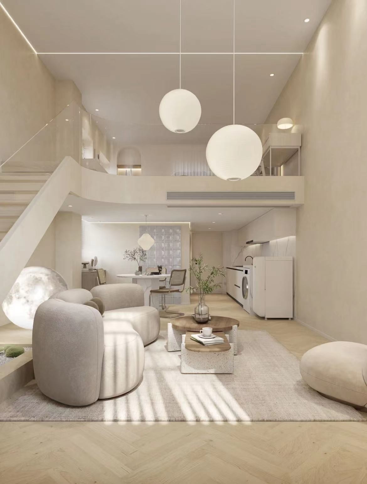 这是一个loft户型设计,业主是个年轻的文艺女青年,喜欢暖暖的奶油风