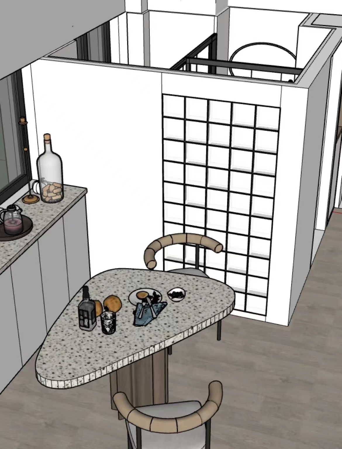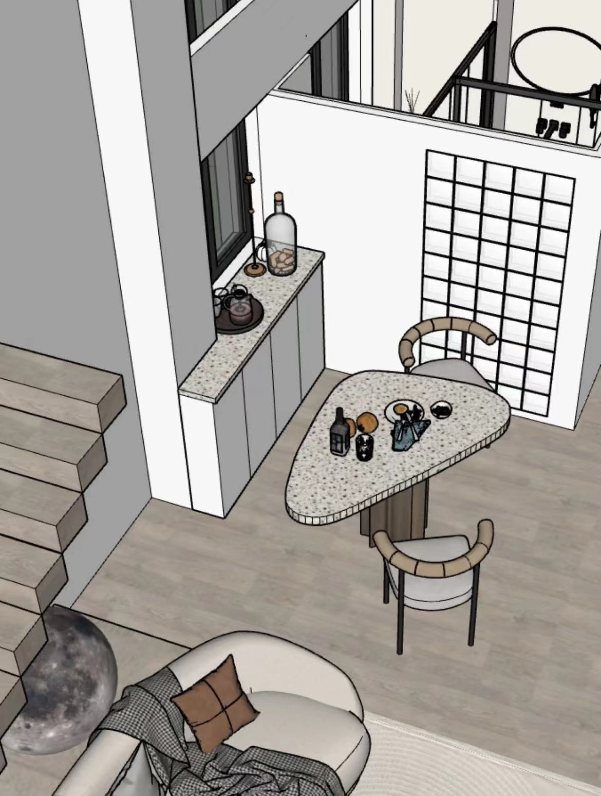 厨房餐桌选用了不规则几何图形,增加了空间的活泼性