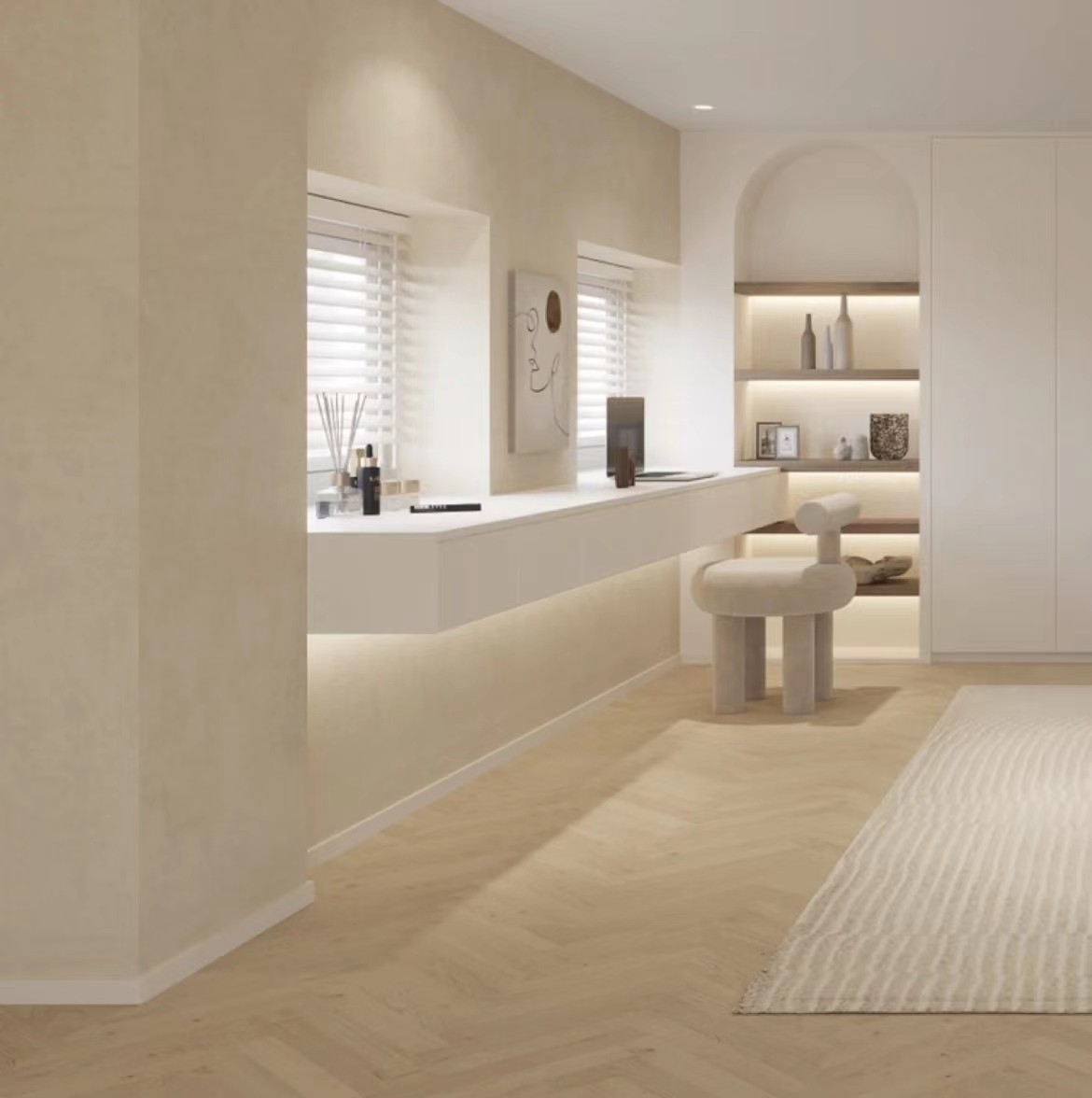 卧室以简洁舒适为主,白色的一体化柜体,一边采用弧形造型做了开放格柜子,使得整体空间充足造型感