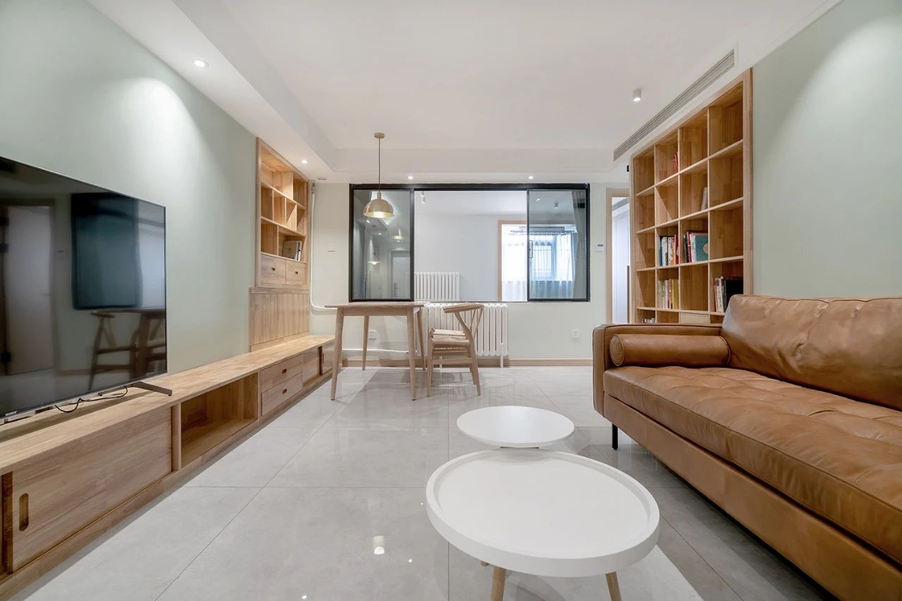 暖棕色皮质沙发,带有一种复古怀旧的味道,结合淡淡绿色的背景空间既温馨又安静。客餐厅通过餐厅的卡座形成很好的空间衔接,卡座与电视柜一体定制,整体性强,同时也让进出主卧和厨卫动线更合理