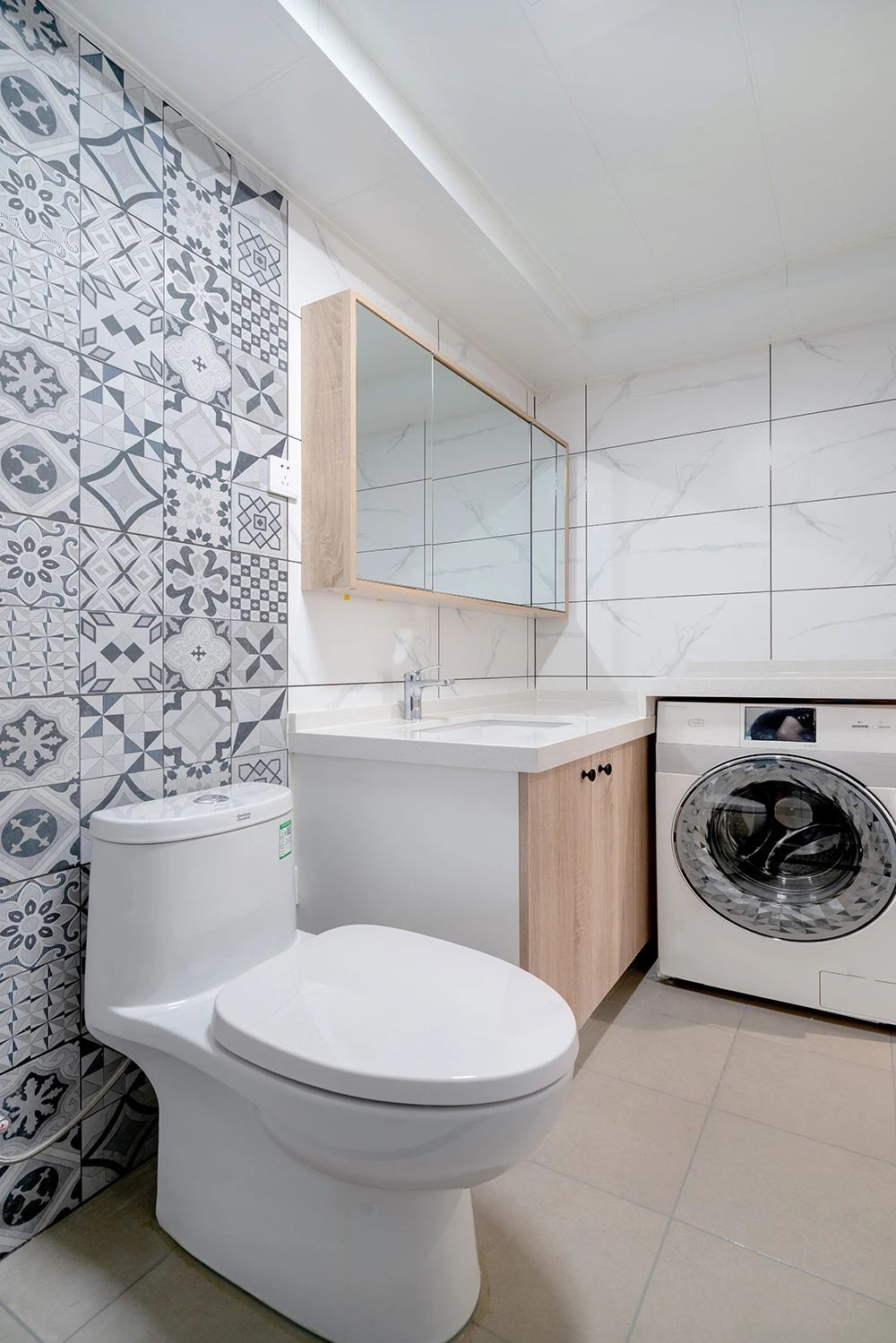 卫生间内利用转角柜体将洗衣机合理的嵌入,实用性强、整洁美观。马桶后铺贴小花砖,打破白色的单调,增加趣味性。淋浴房后期会装浴帘,让空间不那么局促