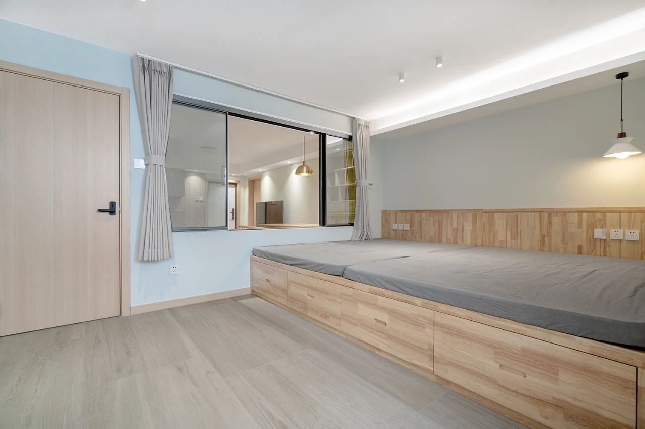 主卧的床采用了榻榻米的形式,大大的提升了屋里的收纳空间,一些换季的东西都可以有效的解决了