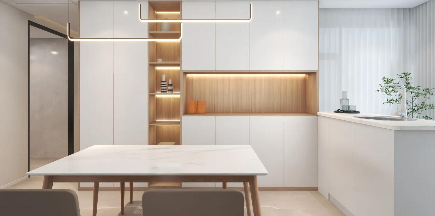 开放式餐厅增加整体空间的互动感,原木家具搭配暖色灯光增加了整体空的温馨感。