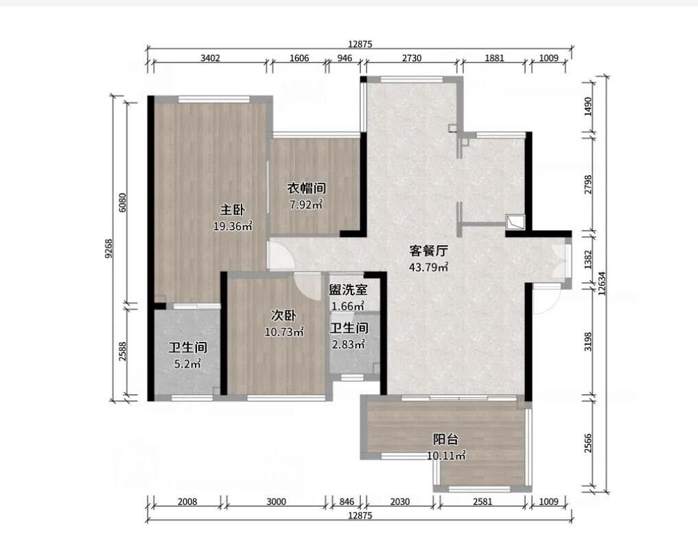 该空间为三室两厅占地面积118㎡。