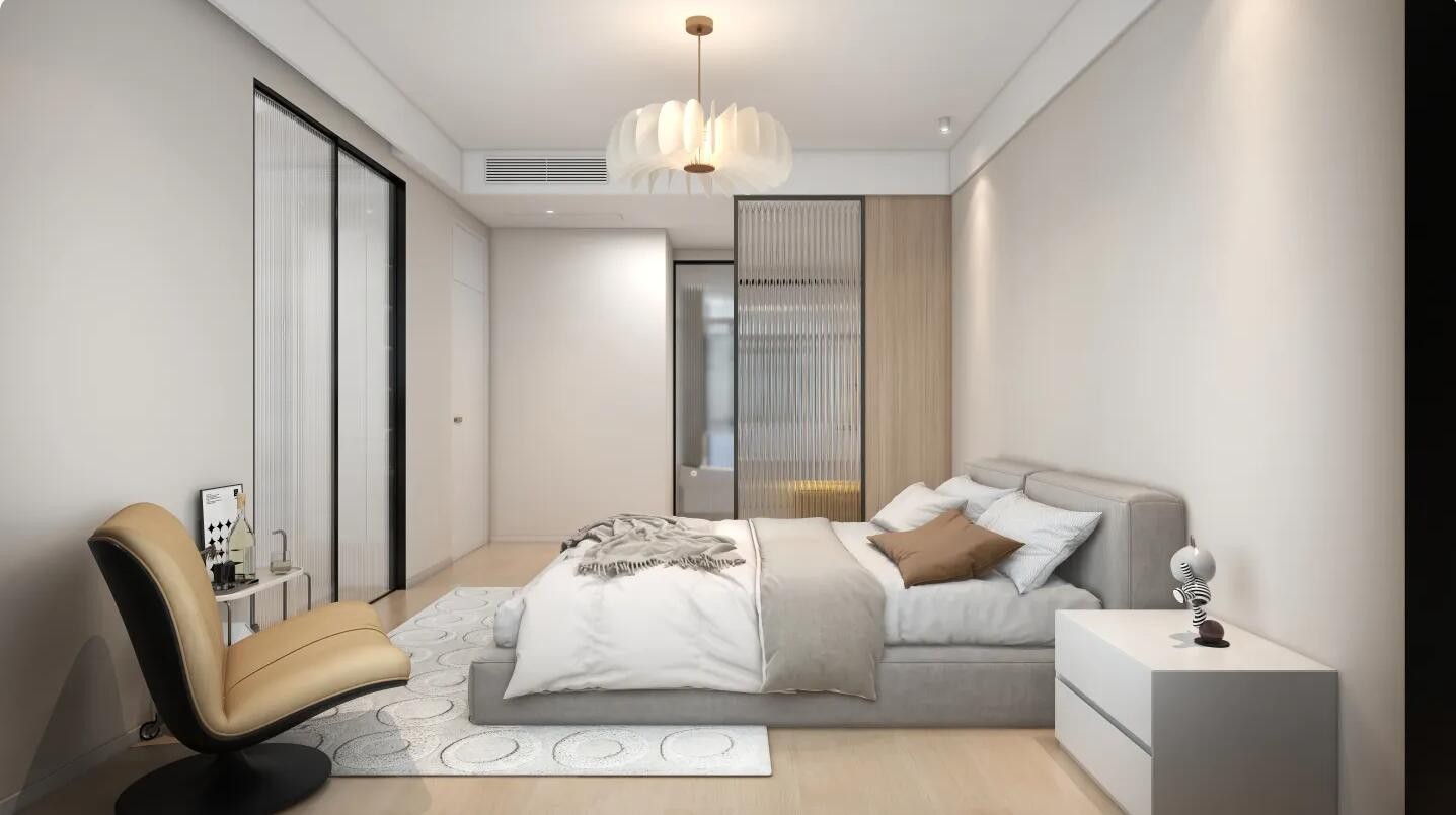 超大落地窗搭配奶咖色为主题色加上暖色灯光的烘托,整体空间比较透亮温馨。