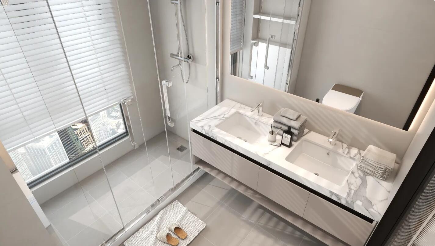 整体空间采用奶咖色色调,使整体空间更加柔和,浴室玻璃门与镜子相互折射增加了整体空间的通透感。