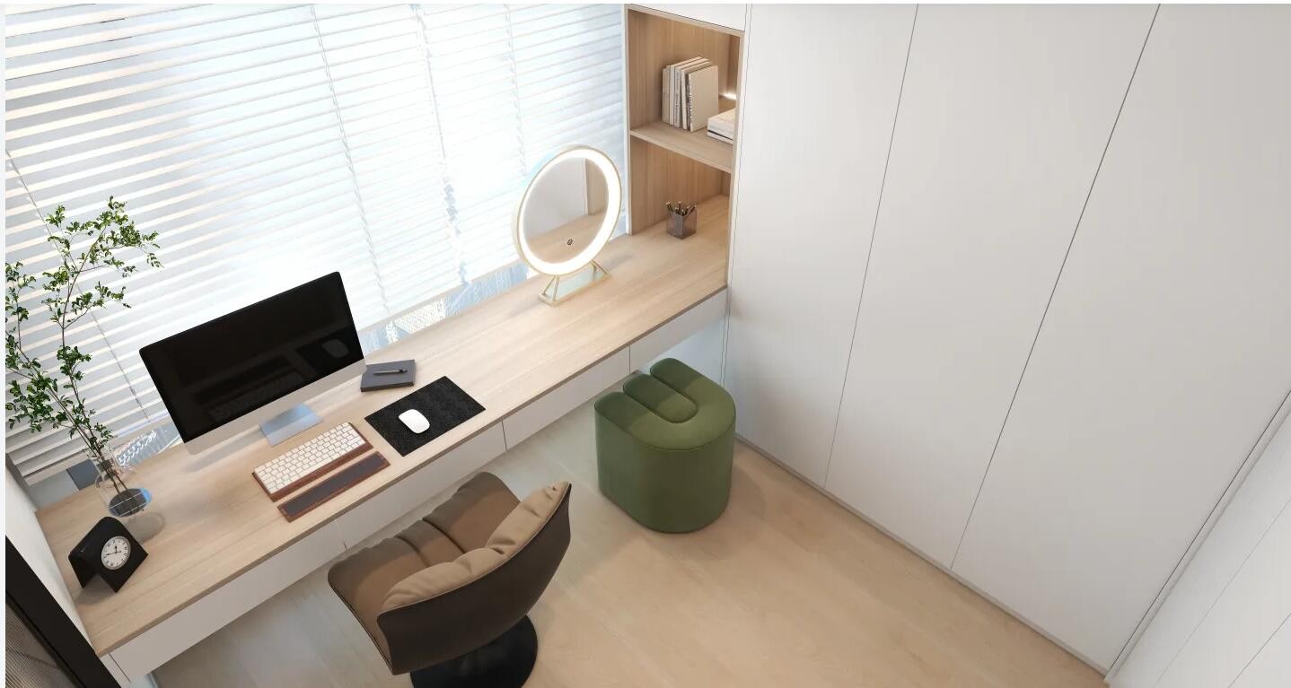落地柜与书桌相结合合理利用了整体空间的可实用性,有效增加了收纳空间与化妆空间的空间活动范围。