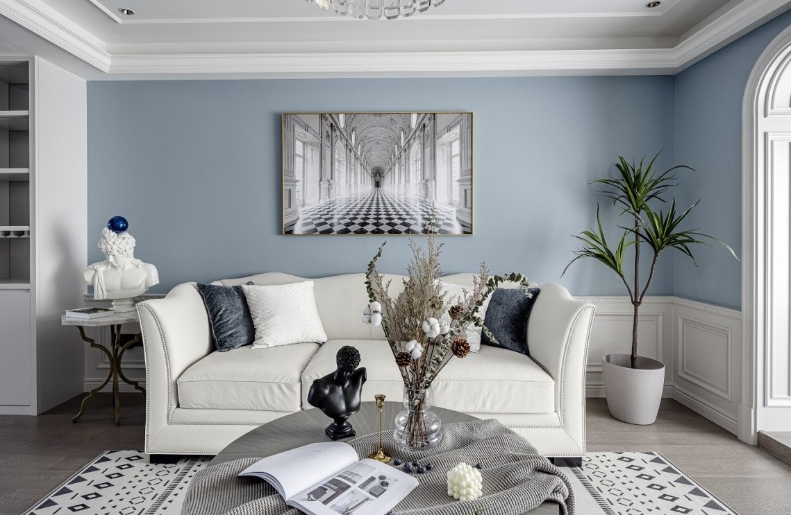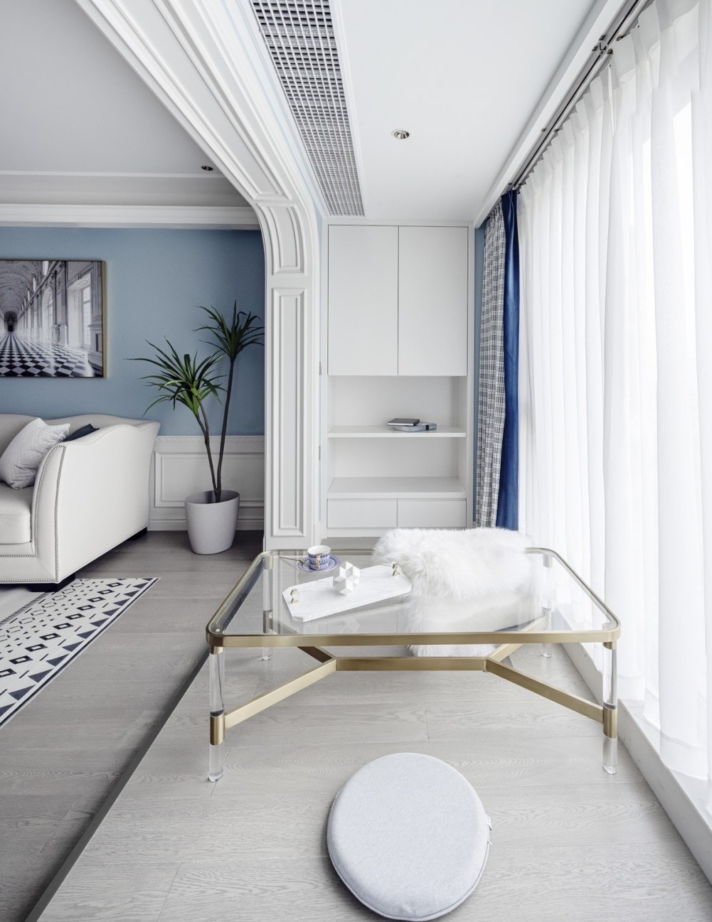 蓝白经典组合的简洁张力配搭温和金色的柔性美感,张弛有度的配色打造出落落大方的时尚客厅。