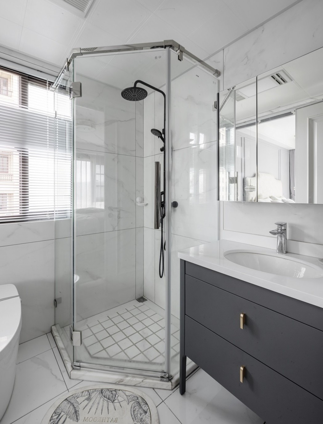 现代浴室,白灰基调中融入黑色点缀,大理石纹理砖面更显雅致。独立淋浴间以透明玻璃隔断,干湿分离。黑色洗手台搭配白色水槽,简约而不失格调。