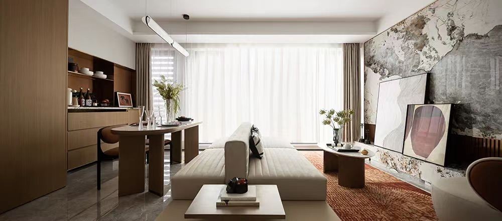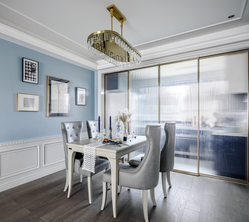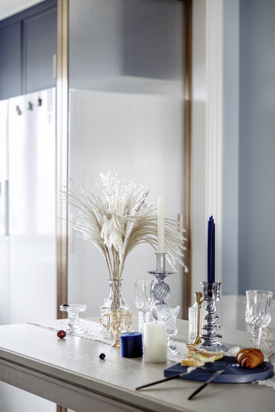 餐边柜使用玻璃背板,增加视觉通透感的同时,也提升空间色彩的纯粹感,清晰干净使空间泛起一丝丝涟漪……