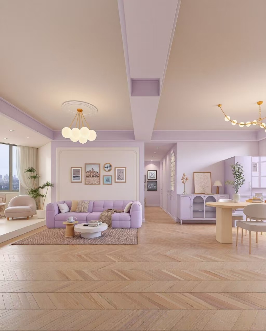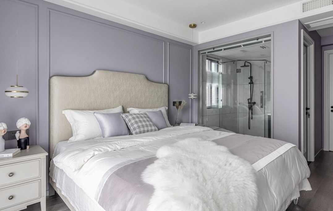 浅薰衣草色打底的素色纹理给人知性、优雅的一面,简简单单的装饰性用于区别空间层次以及创造色彩自然过渡的情景,这种毫不设防地、不具任何攻击力的色彩搭配,有种温柔阳光穿透树梢般的梦幻感觉。